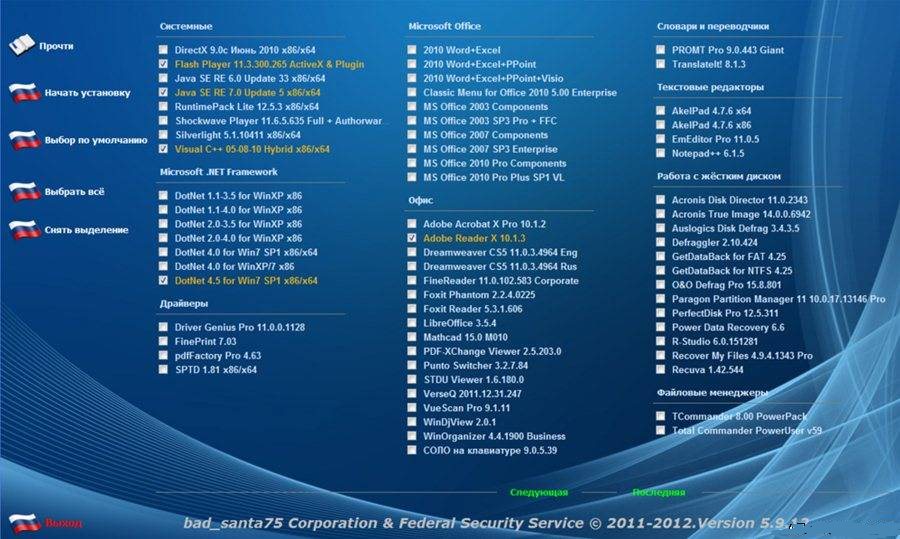 Microsoft .NET Framework 1.1-4.0 for WinXP x86 Microsoft .NET Framework 4.0 for Win7 SP1 x86/x64 Microsoft .NET Framework 4.5 for Win7 SP1 x86/x64 FinePrint 7.10 pdfFactory Pro 4.70 NVIDIA PhysX 9.12.1031 SPTD 1.83 x86/x64 AkelPad 4.8 EmEditor Pro 12.0.7 Notepad++ 6.2.2 Microsoft Office 2003 Professional SP3 + ConvertorsPack Microsoft Office 2007 Enterprise Microsoft Office 2010 Professional Plus SP1 VL PROMT Pro 9.0.443 Giant TranslateIt! 8.1.3 Dicter 3.32 QTranslate 4.1.0 Adobe Reader XI 11.0.0 Adobe Acrobat XI Pro 11.0.0 Adobe Dreamweaver CS5 11.0.3.4964 ABBYY FineReader 11.0.102.583 Corporate FontExpert 2011 11.0.0.3 Foxit Phantom 2.2.4.0225 Foxit Reader 5.4.4.1128 Cool Reader 2.0.66.5796 Mathcad 15.0 M020 PDF-XChange Viewer 2.5.207 Punto Switcher 3.2.8.94 STDU Viewer 1.6.191 СОЛО на клавиатуре 9.0.5.55 VerseQ 2011.12.31.247 VueScan Pro 9.1.20 WinOrganizer 4.4.1900 Business WinDjView 2.0.2 ЛовиОтвет 6.0.78.19 2ГИС 3.12.0.1 7-Zip 9.20 7-Zip 9.30a FreeArc 0.67 HaoZip 3.0.1.9090 WinRar 4.20 Universal Extractor 1.6.1.65 Total Commander 8.01 PowerPack Total Commander PowerUser v60 Far Manager 3.0.3000 Acronis Disk Director 11.0.2343 Home Update 2 Acronis True Image 2013 16.0.0.5551 Auslogics Disk Defrag 3.5.0.10 O&O Defrag Pro 16.0.183 PerfectDisk 12.5.1.312 Professional Power Data Recovery 6.6 R-Studio 6.1.152029 GetDataBack for NTFS 4.32 GetDataBack for FAT 4.32 AIDA64 2.70.2200 Business/Extreme Edition CrystalDiskInfo 5.1.1 + Shizuku Edition CrystalDiskMark 3.0.2 + Shizuku Edition HashCheck 2.1.11 HashTab 5.0.0.19 HD Tune Pro 5.00 Hard Drive Inspector Pro 3.99.441 Hard Drive Inspector for Notebooks 3.99.441 MSI AfterBurner 2.3.0 AusLogics BoostSpeed 5.4.0.10 AnVir Task Manager 7.0.4 CCleaner 3.24.1850 TuneUp Utilities 2013 13.0.3000.132 EasyBCD 2.2.0.182 Glary Utilities 2.51.0.1666 System Explorer 4.0.0.5025 Reg Organizer 5.46 Registry Workshop 4.6.0 TeraCopy 2.3 TimePC 1.5 PowerOff 6.4-05 USB Safely Remove 5.1.3.1186 Zentimo xStorage Manager 1.6.3.1219 Revo Uninstaller Pro 2.5.9 Your Uninstaller! Pro 7.4.2012.5 Uninstall Tool 3.2.2.5287 Unlocker 1.9.1 VirtualBox 4.2.4.81684 VMware Workstation 9.0.1.894247 Lite VMware Tools Linux 9.2.2