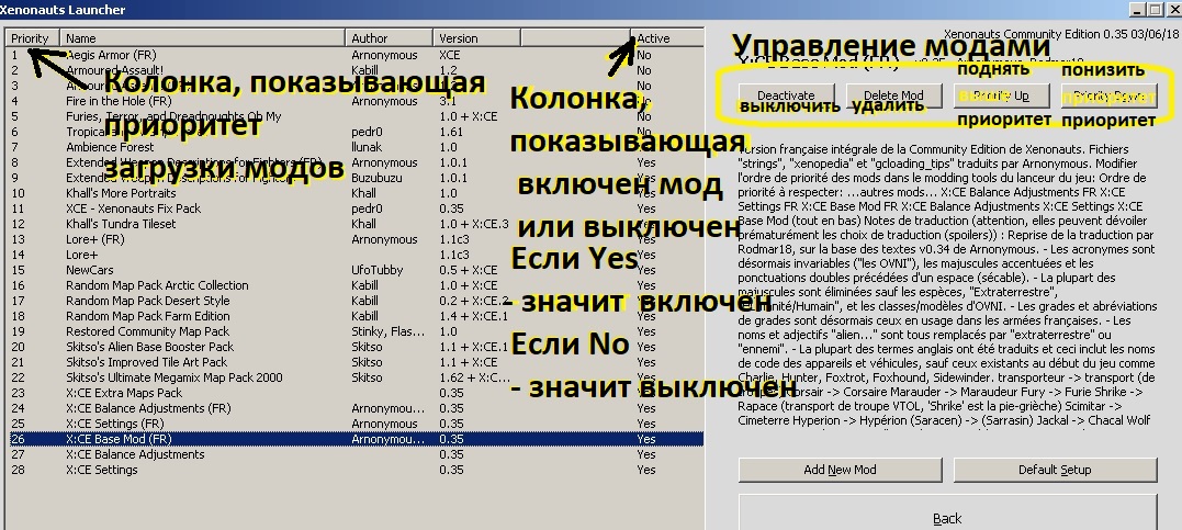 Картинка 2 - это просто указание где в лаунчере находится кнопка отвечающая за открытие окна "Modding Tools", перейдя в которое можно настроить порядок загрузки модов. А Картинка 3 - это описание основных функций окна Modding Tools, используя которые, нужно изменить порядок выложенных здесь модов - читайте что указано в моей инструкции в пункте "6. Теперь настроим порядок загрузки модов..." . Ниже я воссоздал Картинку 3 (так как оригинал у меня не сохранился), взяв чужой скриншот из интернета, но учтите что моды и их порядок, которые указаны там - не подходят к моей инструкции (настраивайте моды по моей инструкции).