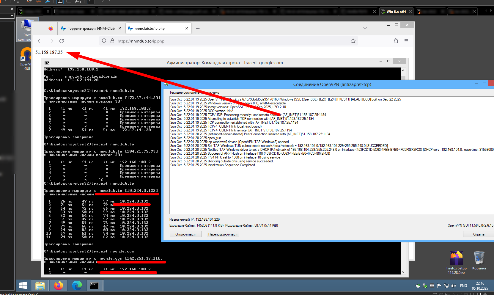 Но при этом я вижу просьбу исправить что-то у нас. Я не разработчик, и увы, в отличие от некоторых с трудом догадываюсь, о чем Вы пишете, поэтому ознакомьтесь с вот этим ВАЖНО! ПРОЧИТАЙТЕ ПЕРЕД СОЗДАНИЕМ ТЕМЫ! , может быть это поможет мне лучше понять Вас, чтобы я донес мысль до того, кто может что-то исправить с нашей стороны, если исправление требуется у нас, или если мы можем что-то не исправить, а изменить, чтобы что-то заработало у Вас с тем колхозом и нагромождением. P.S. Могу позже предоставить удаленный доступ к свежеустановленной и свежеобновленной оригинальной Win8.1 с уже установленным браузером Firefox Setup 115.28.0esr, на всякий случай там же на рабочем столе приготовлены дистрибутивы Cloudflare_WARP_2025.7.176.0, последний OpenVPN-2.6.15-I001-amd64, более старый OpenVPN-2.5.6-I601-amd64, и наш конфиг NNMClub.ovpn. Там можно будет попробовать и посмотреть, что и как работает в нормальных условиях, а затем воспроизвести свою ситуацию. Это чтобы не говорили, что мы не заинтересованы в решении вопроса, а такие предложения я делаю невероятно редко. Если проблема с нашей стороны, а не в колхозе, который будет построен, и если будет понятно, что нужно исправлять, то попробуем исправить. |
