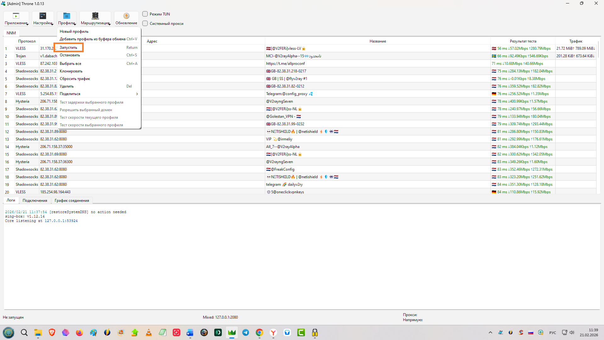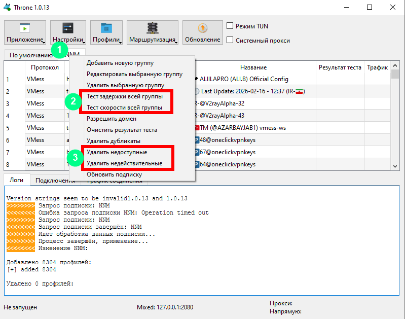 - Запускаем тестирование всех серверов (каждую подписку/группу тестируем отдельно)