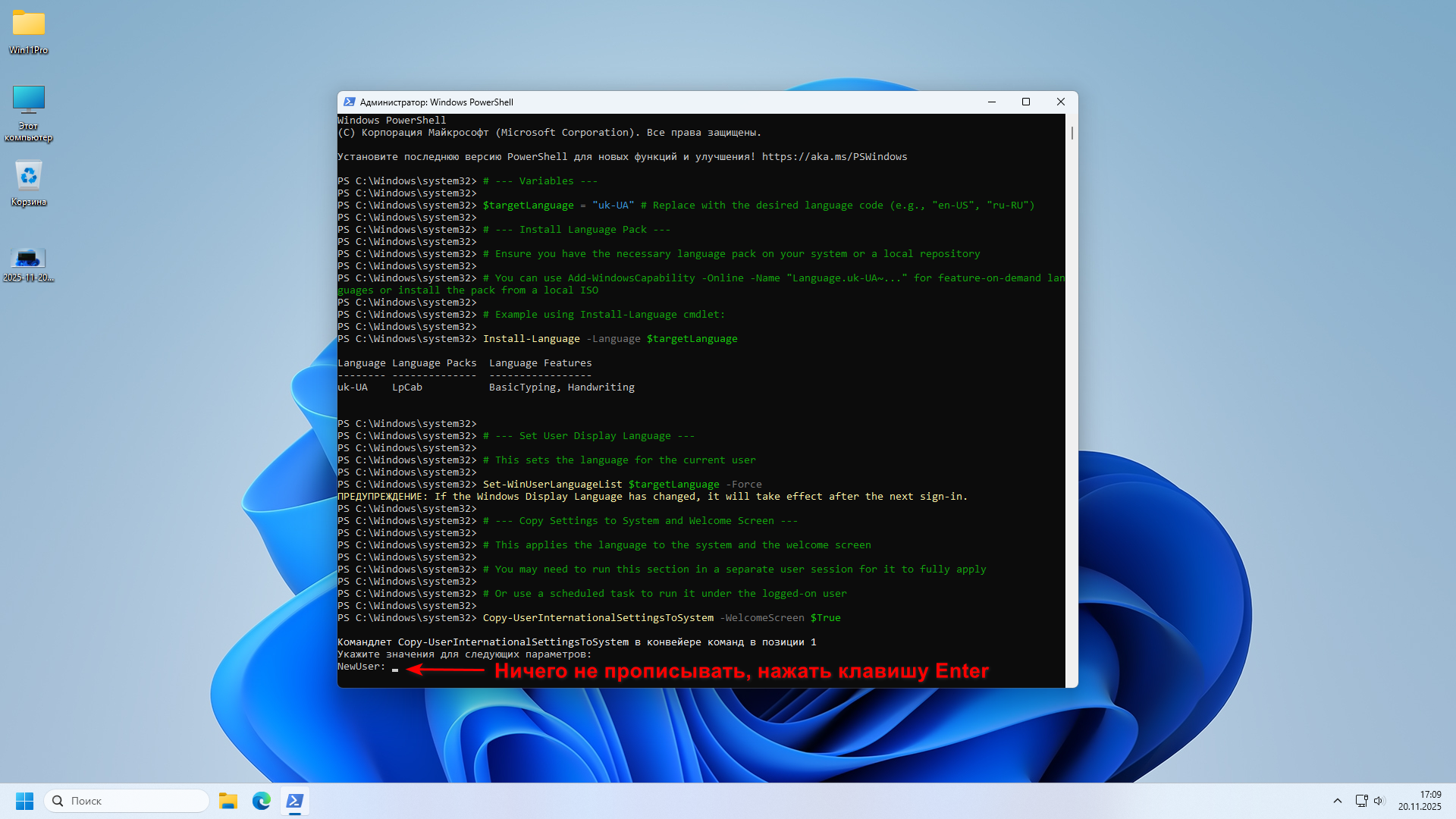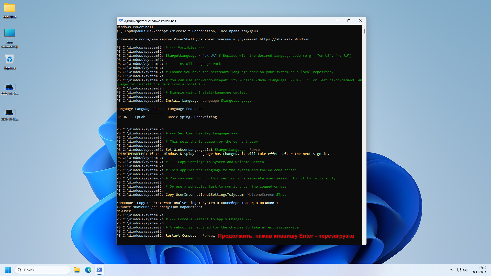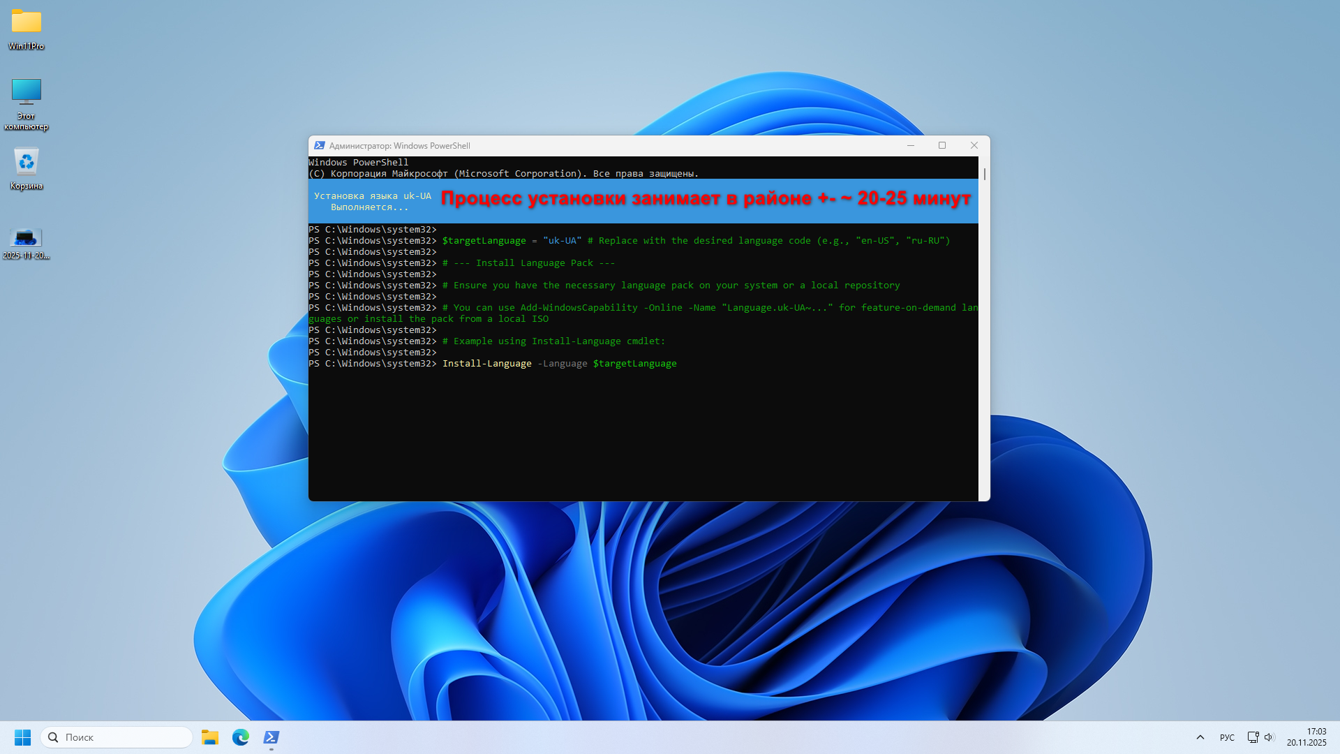 OminiknightИнструкция: по установке полной локализации Windows 11 на родной язык или другой предпочитаемый. • В спойлере скопировать скрипт команду полностью • Запустить Windows PowerShell от имени Администратора • Вставить скопированый текст в окно Windows PowerShell • Дождаться окончания процесса - перезагрузка ПК/Ноутбук Примечание: Процесс установки может показаться зависшим, но подождите, установка занимает +-~ 20 минут. Просто будьте терпеливы и желательно оставить ПК/Ноутбук на это время в покое. Внимание! Интернет подключение обязательно. Чтобы отображался значёк языка на панели задач и в нём уже установленые языки, для этого перейдите в Параметры / Время и язык / Язык / Язык интерфейса Windows и поменяйте язык на любой другой, после обратно на свой родной - решено. Для установки своего родного языка сменить в строках: $targetLanguage = напримере "nl-NL" # Replace with the desired language code (e.g., "en-US", "ru-RU", "nl-NL") # You can use Add-WindowsCapability -Online -Name напримере "Language.nl-NL~..." for feature-on-demand languages or install the pack from a local ISO В остальном в том же порядке, как описано в инструкции выше - решено.