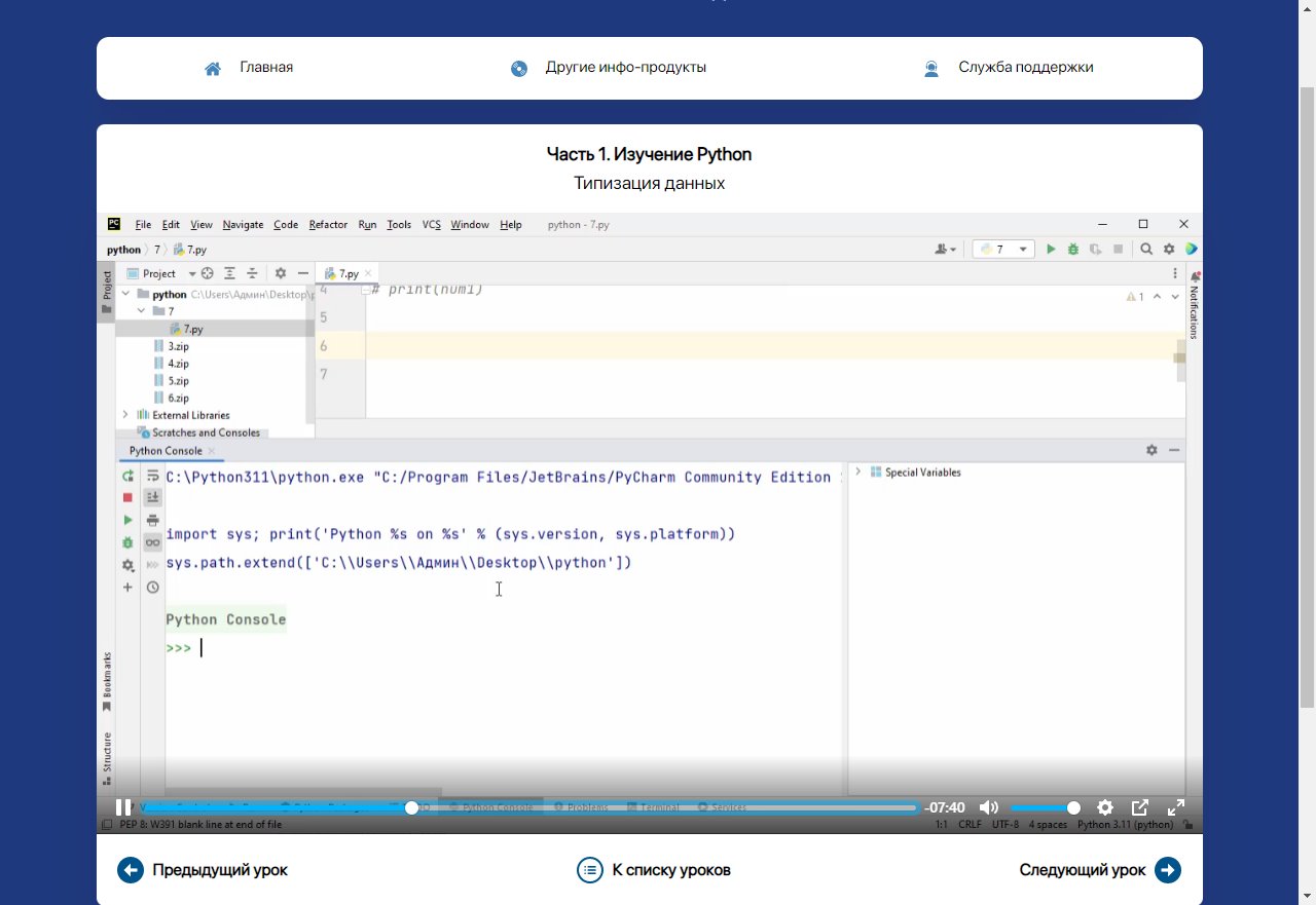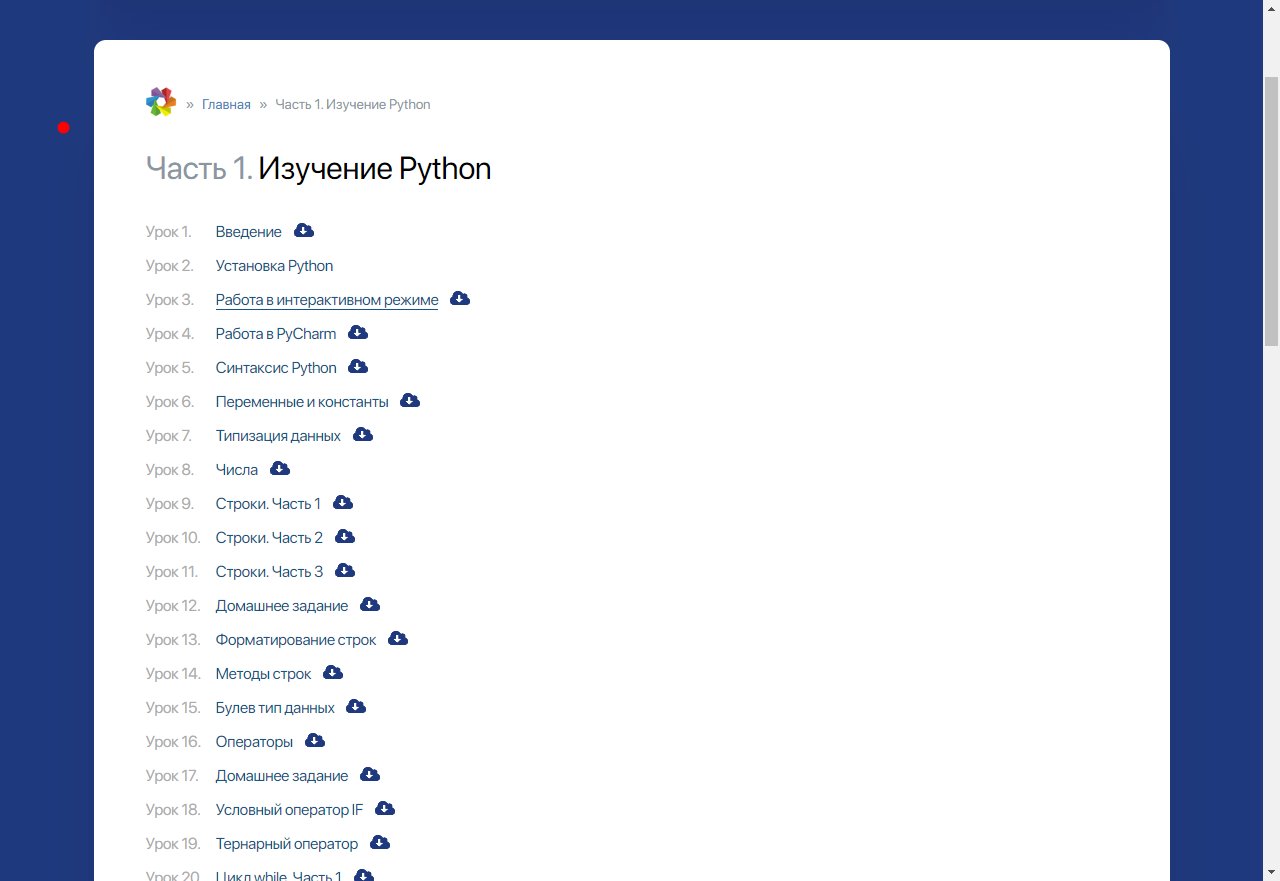 Первая часть состоит из 61 урока общей продолжительностью более 22 часов и посвящена исключительно изучению Python. В курсе используется последняя доступная версия на момент записи курса – Python 3.11. Изучение построено от простого к сложному и, соответственно, курс будет начат с таких базовых вещей для любого языка программирования, как: синтаксис языка, типы данных, переменные, операторы и т.п.