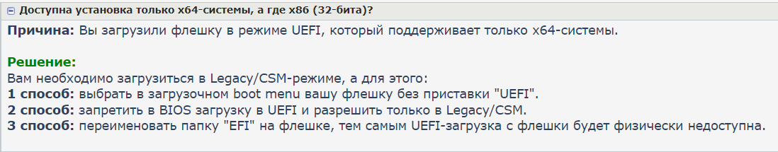 Решение: Вам необходимо загрузиться в Legacy/CSM-режиме, а для этого: 1 способ: выбрать в загрузочном boot menu вашу флешку без приставки "UEFI". 2 способ: запретить в BIOS загрузку в UEFI и разрешить только в Legacy/CSM. 3 способ: переименовать папку "EFI" на флешке, тем самым UEFI-загрузка с флешки будет физически недоступна.