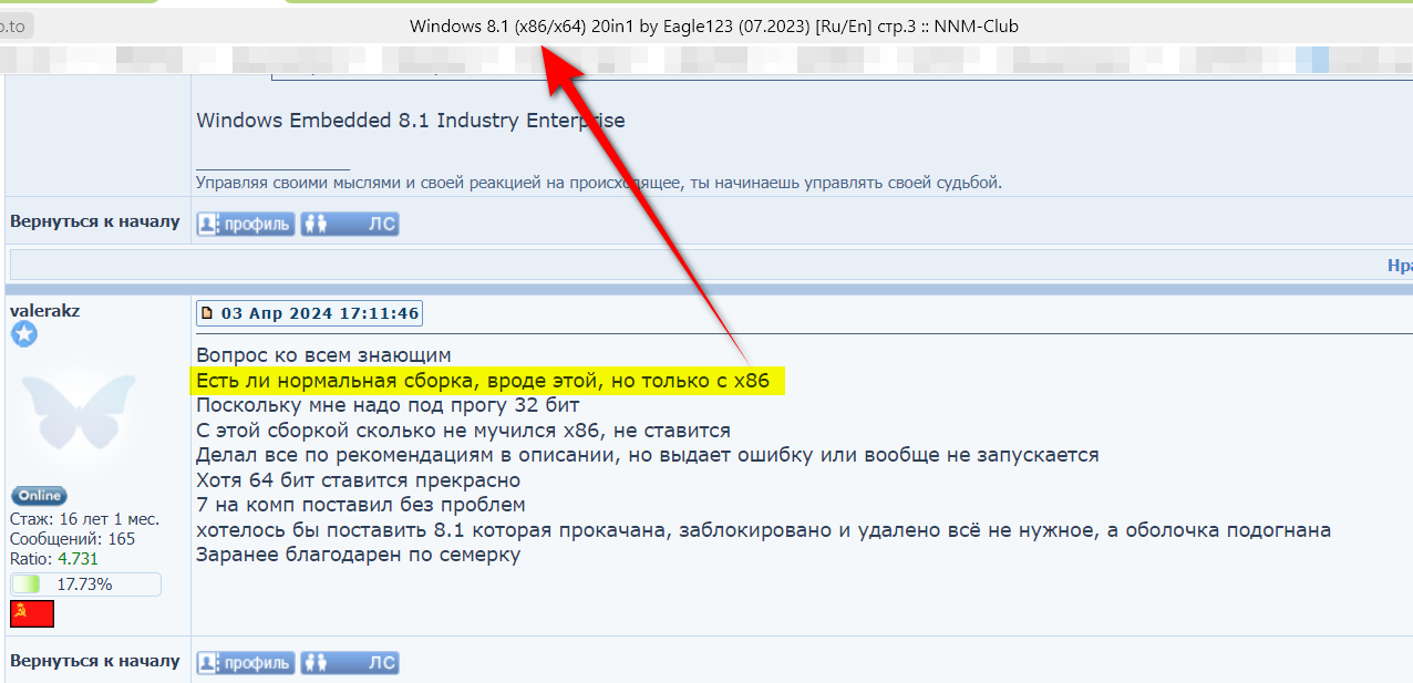 Вопрос ко всем знающим Есть ли нормальная сборка, вроде этой, но только чисто с х86 Поскольку мне надо под прогу 32 бит С этой сборкой сколько не мучился х86, не ставится Делал все по рекомендациям в описании, но выдает ошибку или вообще не запускается Хотя 64 бит ставится прекрасно 7 на комп поставил без проблем хотелось бы поставить 8.1 которая прокачана, заблокировано и удалено всё не нужное, а оболочка подогнана под семерку Заранее благодарен