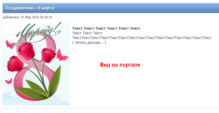 Spirit Summer, если что, последний вариант верстки кода оформления в самом топике, была еще небольшая поправка сделана... Добавлено спустя 23 минуты 53 секунды:Поздравляем с 8 марта! ======================== |