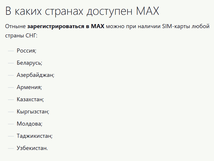 max изначально работал только в России и Белоруссии, сейчас список стран расширился, но это всё страны СНГ - скрин; а с Испанией или любой другой страной, отсутствующей в списке, связь через max недоступна, поскольку иностранцы должны быть зарегистрированы в мессенджере с соответствующими симками из списка; то есть с испанскими приятелями не пообщаешься, также и войти в max в Испании невозможно, поскольку потребуется код из sms, который не придёт из-за ограничений в роуминге, введённых недавно - скрин; нельзя во всём доверять ответам ИИ, иногда надо своей головой думать и проверять инфу ) |
