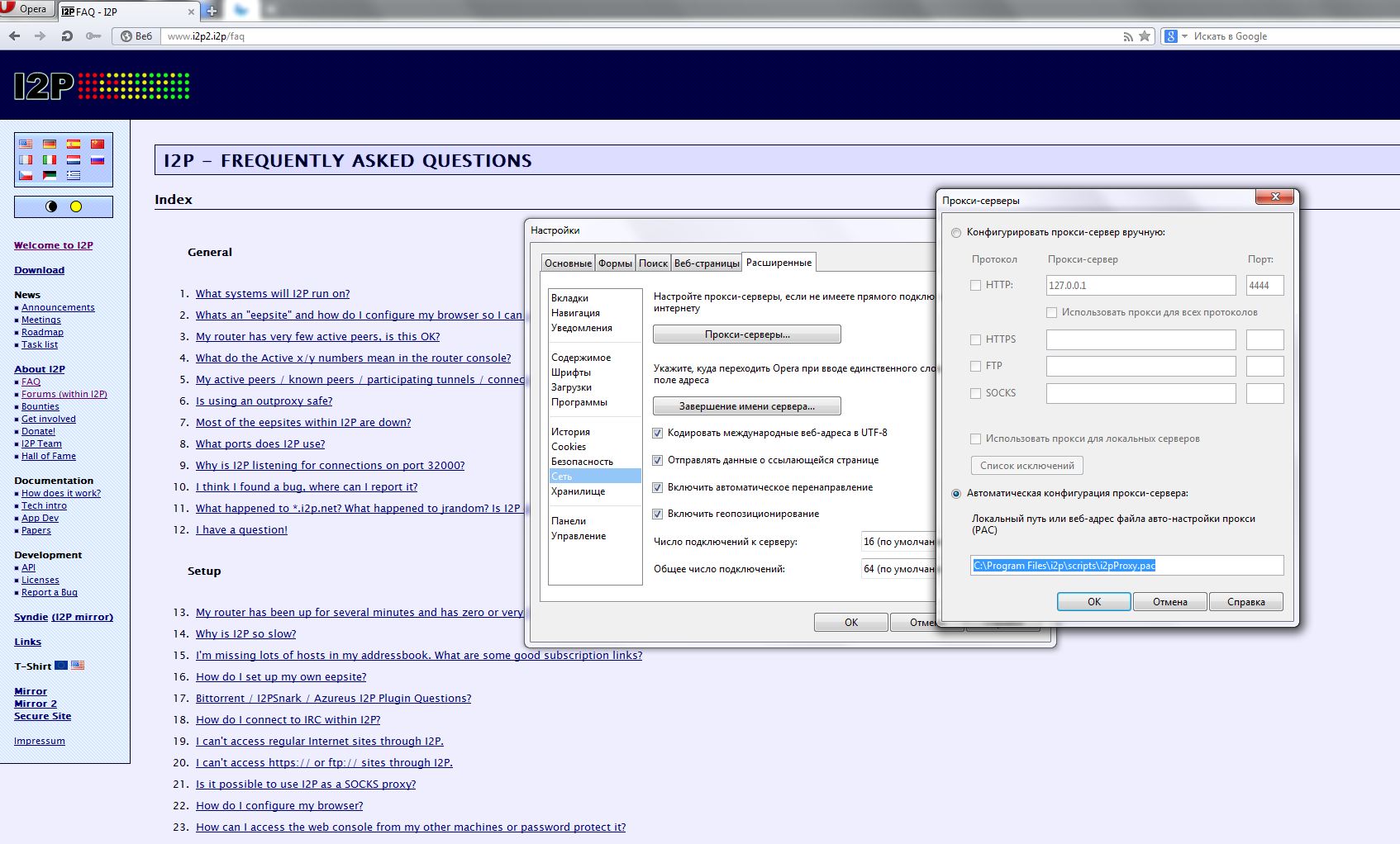 с первого раза удалось настроить i2p - только радость была не долгой. После перезагрузки компьютера - работать перестал. что делать не знаю... пробовалось напрямую 127.0.0.1:4444, отключался антивир и брандмауэр - не работает... но ведь работало! |