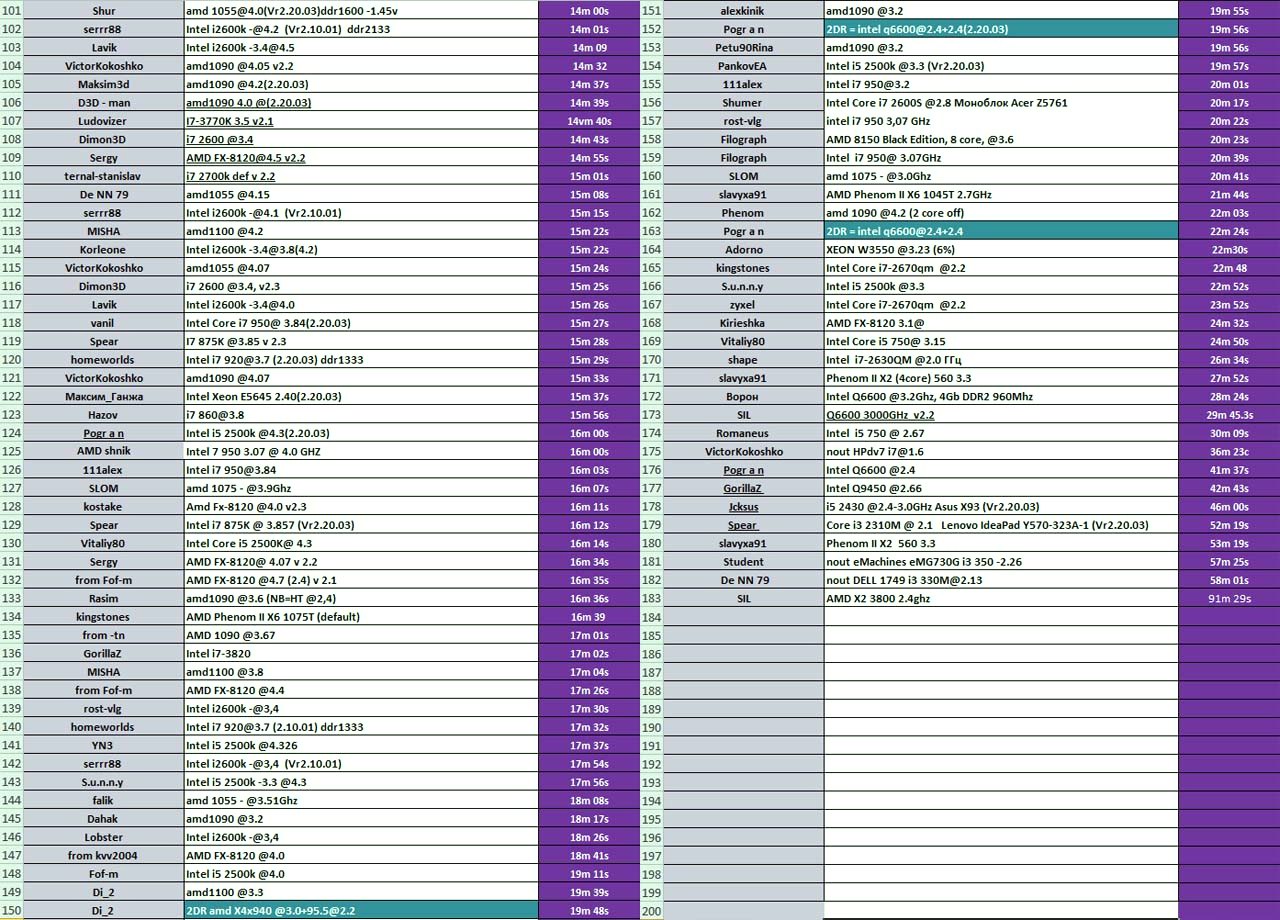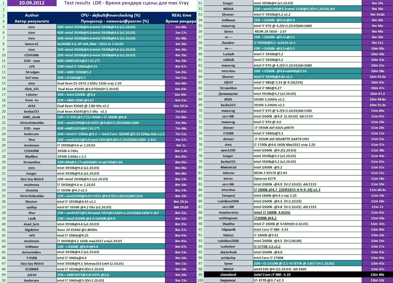 Пояснения: - чем меньше время - тем лучше - DR - Distributed Rendering - распределенные вычисления на несколько машин одновременно, т.е. 3DR значит суммарная производительность 3-х систем с указанными параметрами.Так вот, как можно легко убедиться, разогнанные топовые шестиядерники AMD идут вровень, слегка проигрывая четырехъядерным 2600k в номинале (см. п. 17-18 / 103-104). А 2600k, например у меня, спокойно работает на 5 Ггц вместо 3.4 номинала, что дает чуть ли не 50% преимущество, учитывая практически линейную зависимость от частоты. Дальше. Говоря "соотношение цена - качество (или скорость)" почему-то потраченные средства представляются окончательно выброшенными. И мало кто думает, что процессор может приносить деньги. С тем же рендерингом - мне нужна максимально быстрая однопроцессорная (из-за потребления электричества + вывод тепла + специфичные мат.платы/блоки питания/память и пр.) машина. Взяв интел на 100 евро дороже, но в 1.5 раза производительнее, за свою 2-3-х летнюю жизнь он сэкономит мне многие тысячи. Году так в 2001-2004 соглашусь, Атлоны были хороши и обходили P4 по всем параметрам. Но сейчас - увы.  |