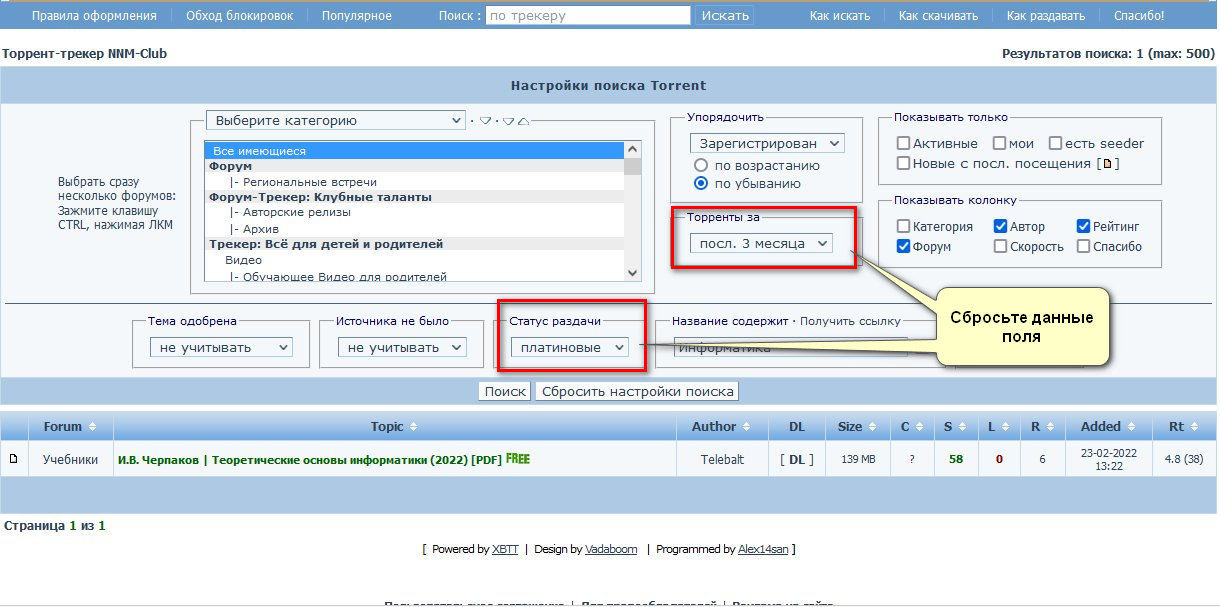 Комрады привет, я тут новичок. Почему-т окогда я залогинен, поиск не работает. Ничего не ищет, или ищет кое-что. Например в скриншоте ниже, по запросу информатика нашло один единсвтенный торрент. А когда НЕ залогинен то нормально ищет "Сбросить настройки поиска сделал" - ничего не изменилось. Сижу с Тор Браузера последнего, актуального с включенным Джава Скрипт. Никаких больше дополнений, файрволов и прочего не стоит. На известный трекер например таких проблем не наблюдаю.