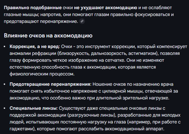 Вы снова ничего не поняли из всего мной вышесказанного, или дурака валяете, упрямо настаивая на своём удобоваримом ) Ещё раз, очки не ухудшают аккомодацию, не вызывают деградацию цилиарной мышцы, даже в адаптивных очках, поскольку глазные мышцы зависят друг от друга, и когда человек переводит взгляд, то мозг посылает пучок команд на глазодвигательные мышцы, круговую мышцу и зависимую цилиарную мышцу, и вся связка будет работать - скрин-1, я же ранее объяснял, а вы ноль внимания - скрин-2, нельзя же быть таким упрямым в своём невежестве; в общем, надоело мне вам разжёвывать уже доказанные понятия, можете оставаться при бабушкином мнении, а можете гуглить, посмотреть строение глаза, увидеть в каком месте расположены глазные мышцы, и стремиться к знаниям, сами решайте, что для вас важнее |