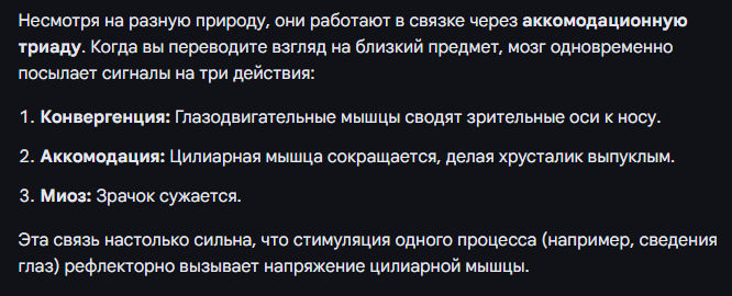 И я об этом. Вы опять написали много слов не относящихся к конкретно обсуждаемому, а именно из Вашего скрина процесс №2 - аккомодация, то бишь изменение выпуклости хрусталика глаза человека. Причем эту систему изменения выпуклости хрусталика считаем валидным. Итак, человек перевел взгляд на предмет имеющий другое расстояние чем прежний. Описанная Вами система отработала на бис: зрачки изменили свое положение, разошлись/сошлись, расширились/сузились, хрусталик изменил свою выпуклость в соответствии с расстоянием до нового предмета. И тут включается в работу микропроцессор, который что? Должен каким-то образом нарушить установленную мышцами глаза гармонию? |