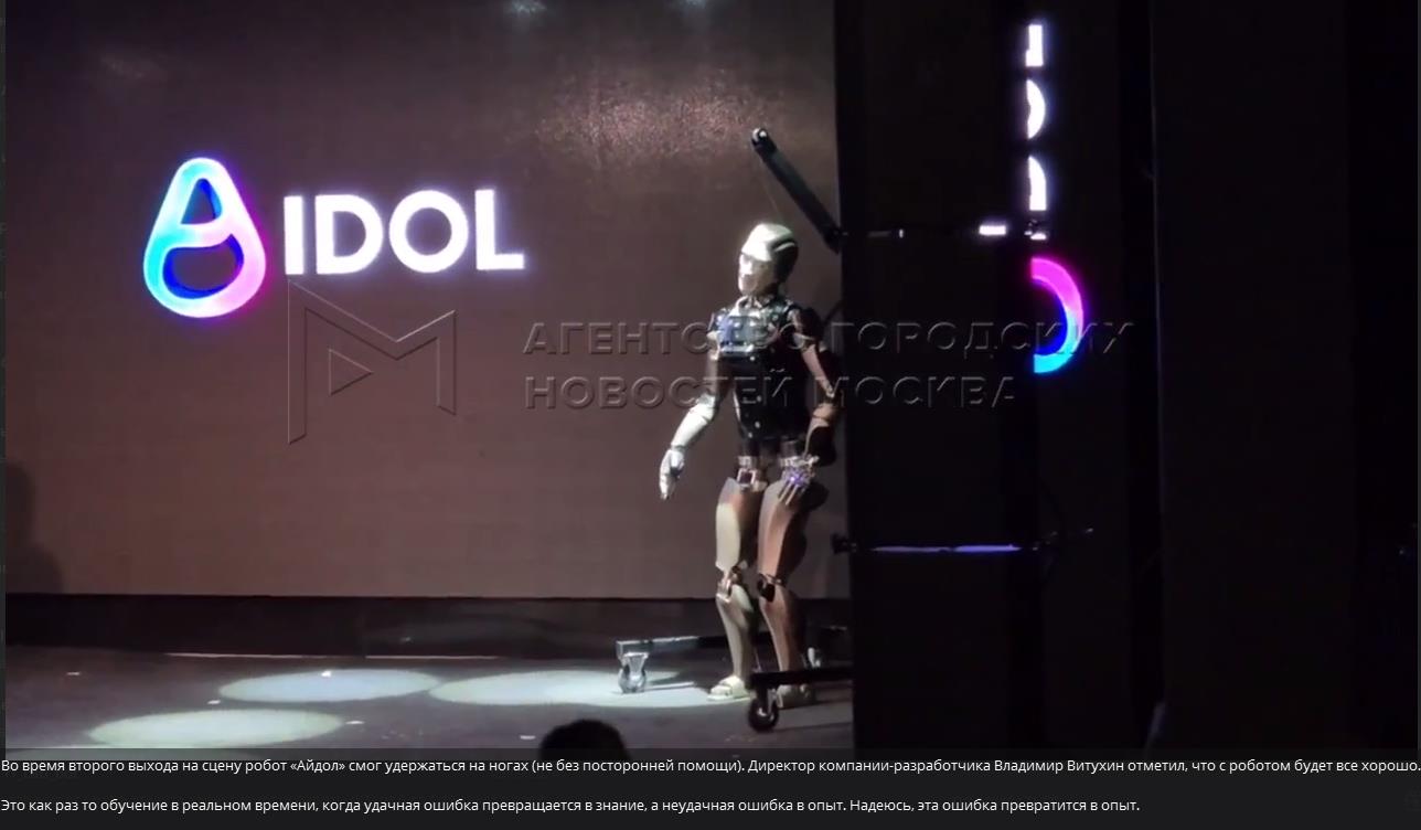 После падения робот не сломался, был второй выход на сцену, но робота уже поддерживали - скрин; кстати никто робота не толкал, робот начал терять равновесие после поднятия правой руки, и сопровождающий, увидев это, пытался немного его подправить, потянув назад, но не получилось; касательно того, что робот должен был упасть, из-за того, что нужно больше денег - это чушь, поскольку деньги уже распределены в "Новой технологической коалиции"; наоборот, производителю выгоднее позитивно заявить о себе, и довести робота до ума; со слов основателя компании "Айдол" Владимира Витухина, возможности робота реализованы только на 77%, а цель - 93%; в данном случае организаторы поторопились с презентацией, несмотря на то, что один из разрабов робота Алексей Южаков предупреждал, что функция передвижения робота ещё сырая