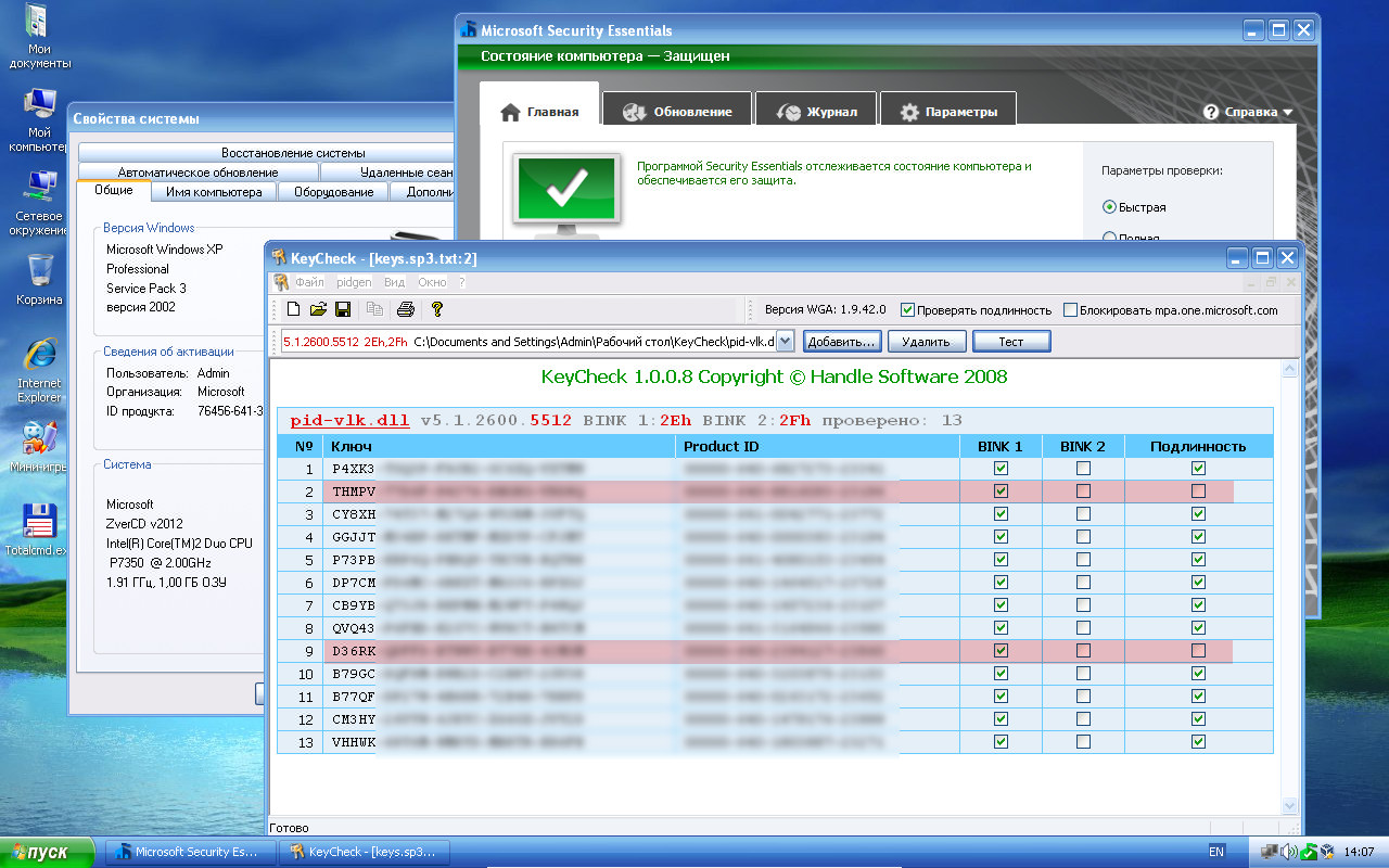chomkaНаличие или отсутствие драйверпаков никак не влияют на проверку подлинности. Все ключи, указанные в eula.txt и winn1.sif проверку подлинности проходят. Из ключей, ранее использовавшихся в сборках Zver, забанены 2 ключа, начинающиеся на D36RK и THMPV. Если вы использовали один из этих ключей проверку подлинности система не пройдет. Возможно у вас проблема с некорректной установкой операционной системы, отсутствием файлов, необходимых для проверки, может это связано с наличием каких то вирусов или применением каких то патчеров, активаторов, удалялок типа WPAKill. Вот скриншот рабочего стола только что установленной системы и установленного майкрософтовского антивируса, а также результата проверки набора ключей.