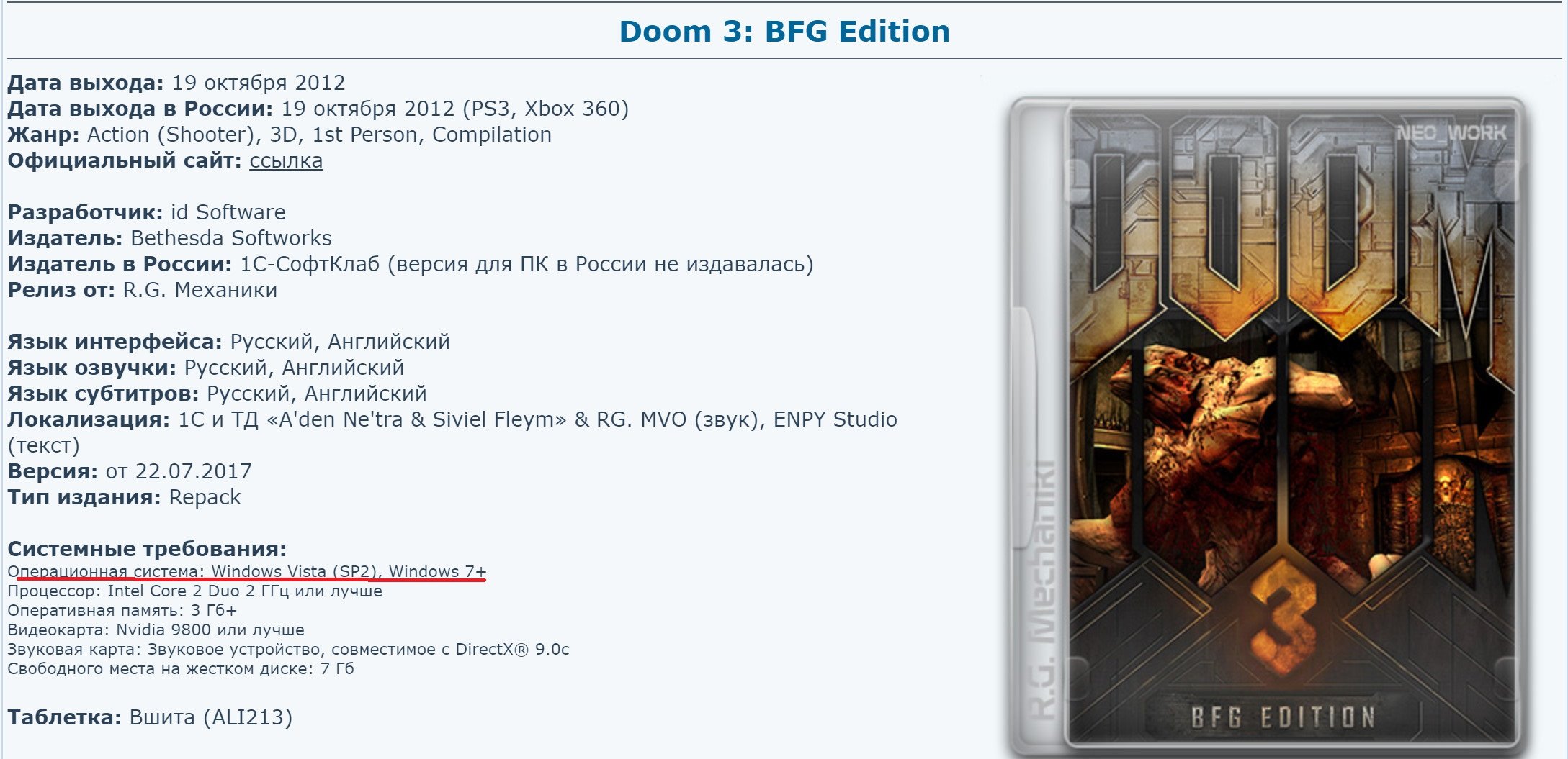 Разработчик: id Software Издатель: Bethesda Softworks Издатель в России: 1С-СофтКлаб (версия для ПК в России не издавалась) Релиз от: R.G. Механики