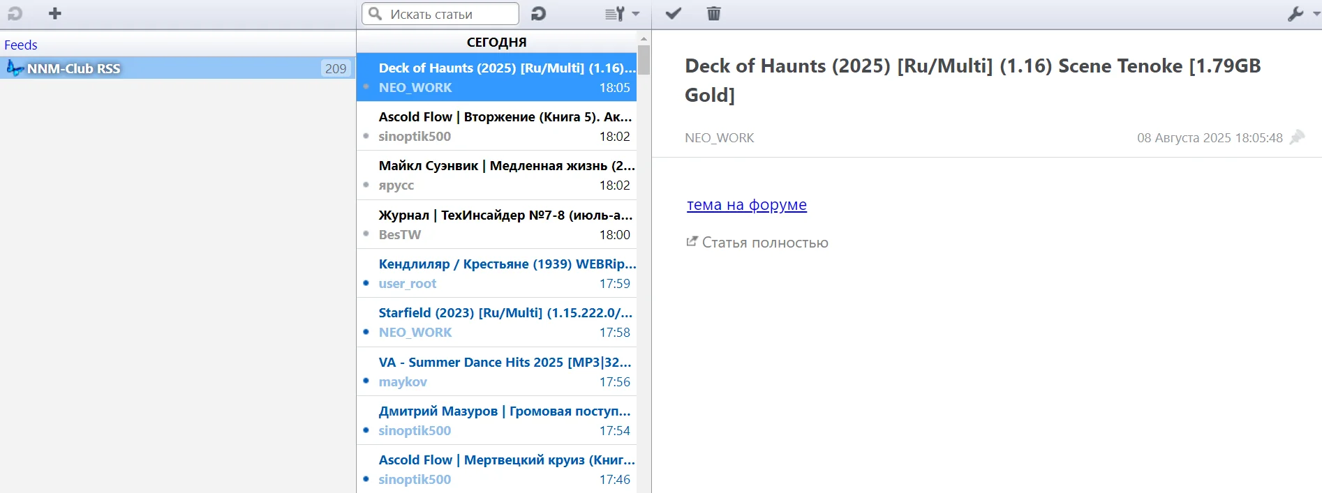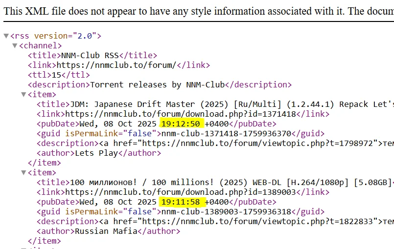 Почему-то лента https://nnmclub.to/forum/rssp.xml впадает в анабиоз. Т.е. обновится рано утром, а следующее обновление уже часов через 12. При это вторая лента https://nnmclub.to/forum/rssd.xml работате без как-либо проблем. Настройки у обоих лент одинаковые, обновление раз в час. Куда копать?