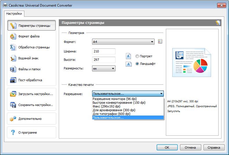 - Быстрая настройка. Библиотека профилей (наборов настроек программы, оптимальных для типичных задач конвертирования) позволяет настраивать Universal Document Converter двумя кликами мыши.