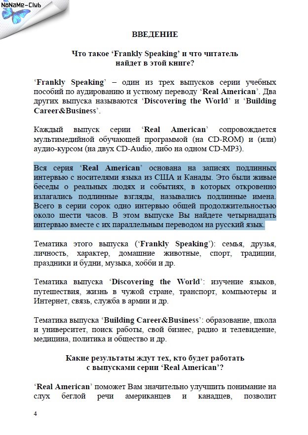 - Выпуск "Frankly Speaking" (Говорим откровенно) содержит интервью по темам: семья, друзья, домашние животные, традиции, хобби и т.д.