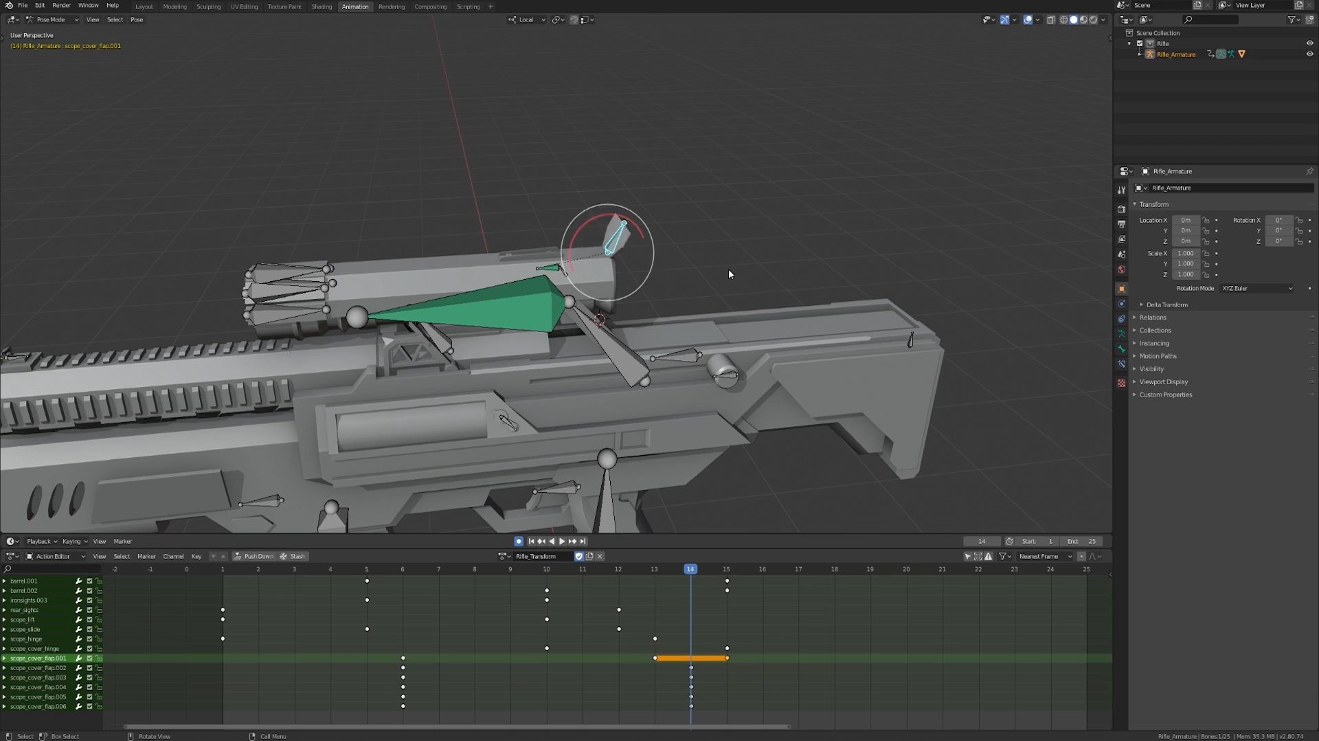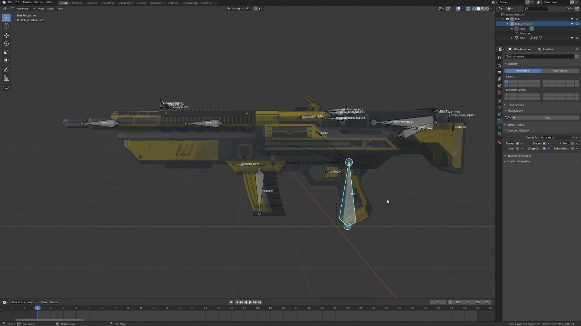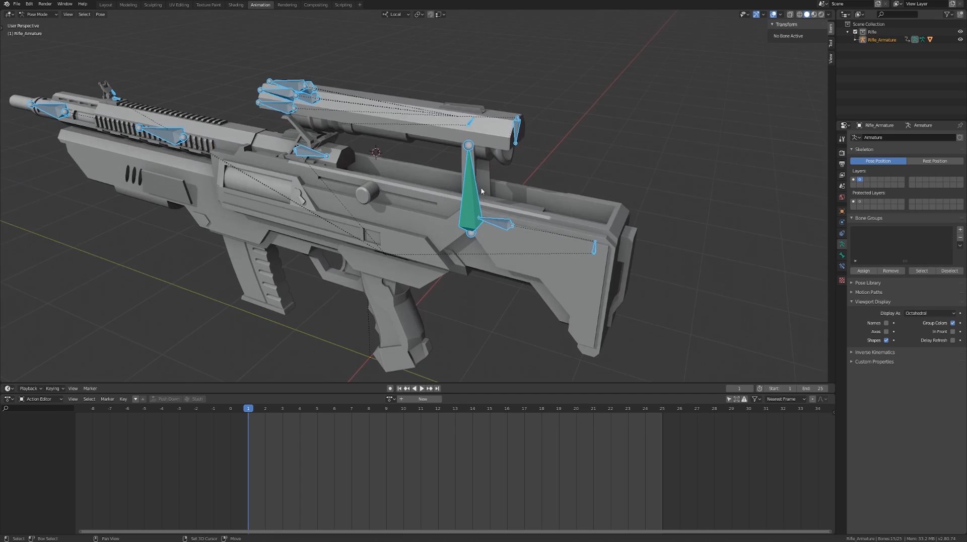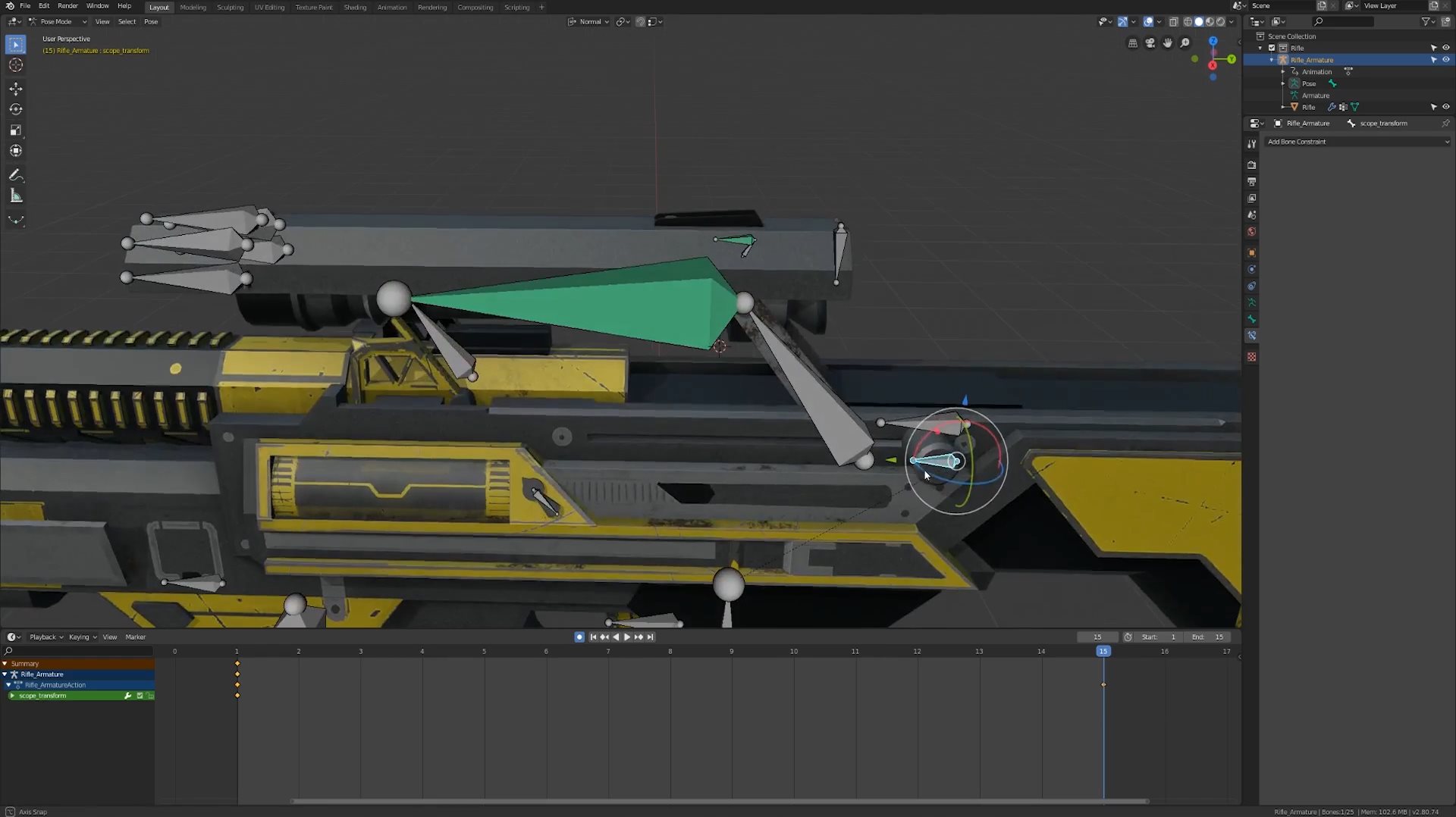 Описание:Узнайте как настроить риг для сложной винтовки в Blender, которая превращается в снайперскую винтовку! Весь эффект полностью контролируется одной костью, так что его будет очень легко анимировать. Если вы можете настроить эту винтовку, вы можете настроить почти любое оружие, которое вы можете придумать. Здесь вы узнате много об арматуре, осях вращения, костных ограничениях, действиях и многом другом!