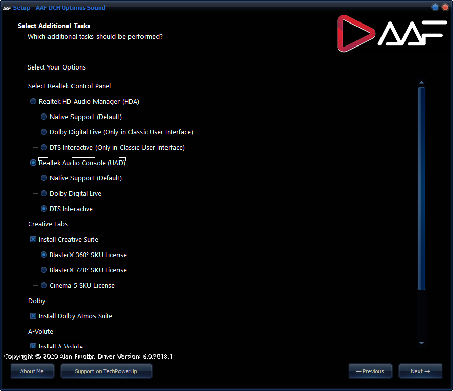 ВНИМАНИЕ! Тем, кому нужен только Realtek аудио драйвер, при установке выберите вариант (HDA или UAD) и снимите галочки с других компонентов.