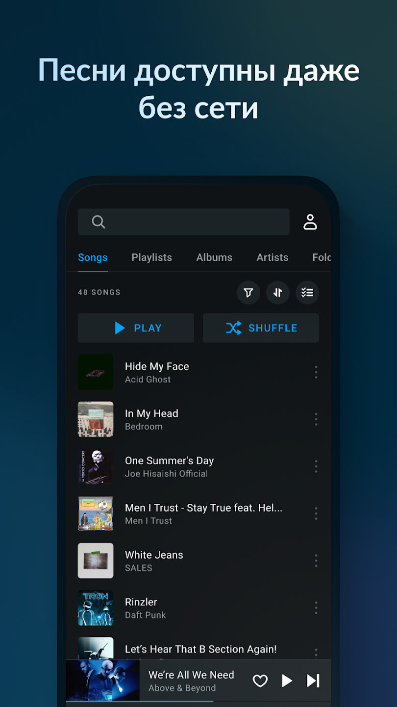 Навигация по сохраненной музыке: песням, исполнителям, альбомам, жанрам и т. д. Создавайте и изменяйте свои плейлисты.