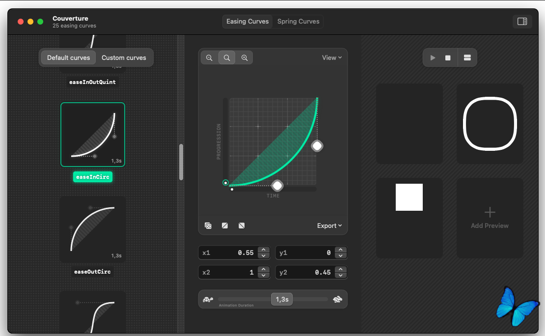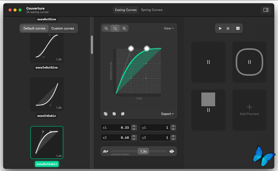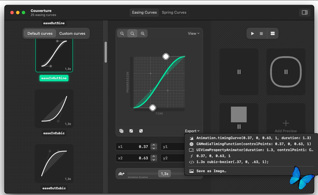 • Экспорт кривых как: SwiftUI, CoreAnimation, UIKit, CSS , Изображение (PNG), литералы с плавающей запятой. Плавающие значения совместимы с большинством инструментов проектирования, поддерживающих временные кривые (например, Figma, After Effects, Motion)