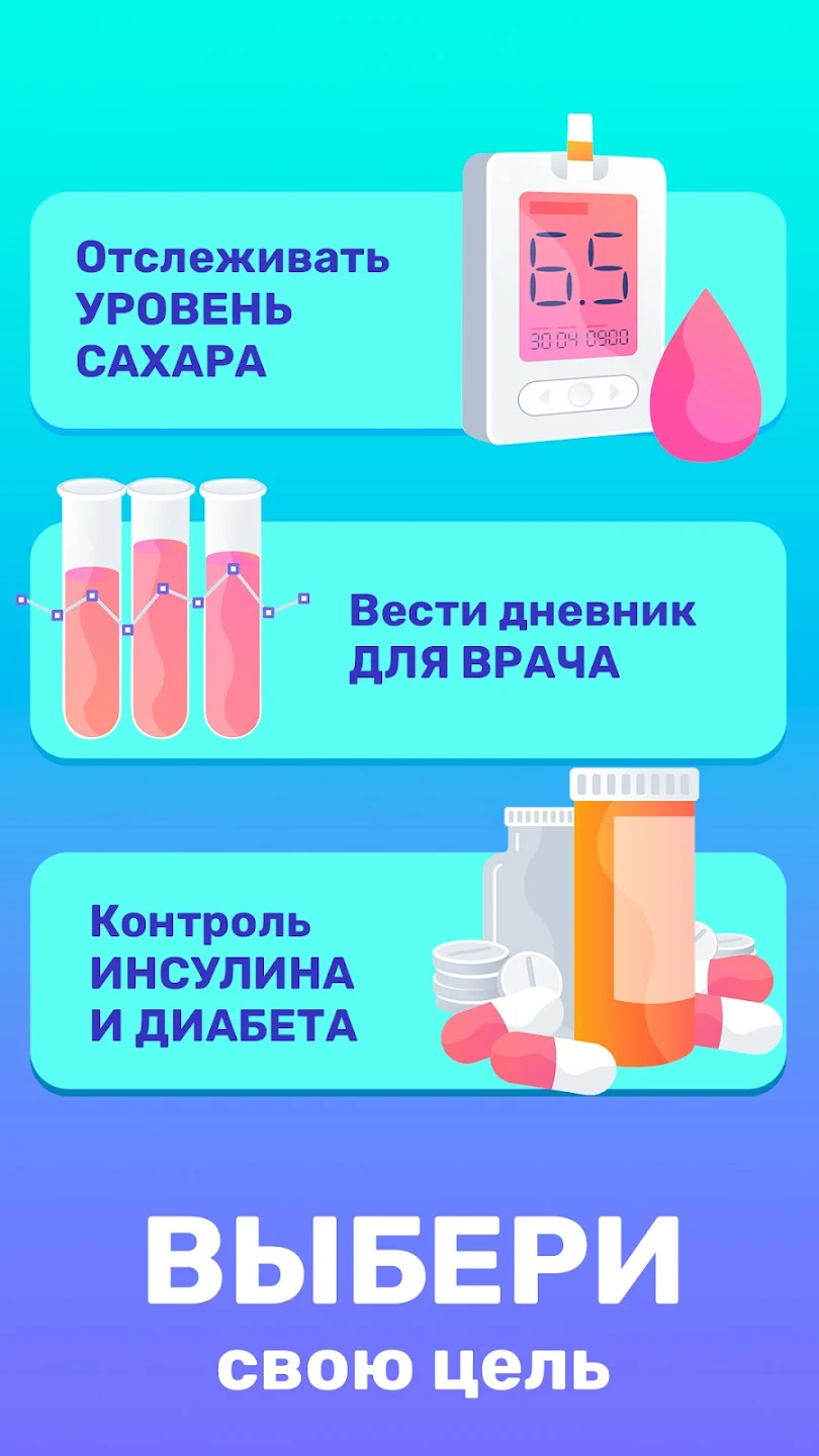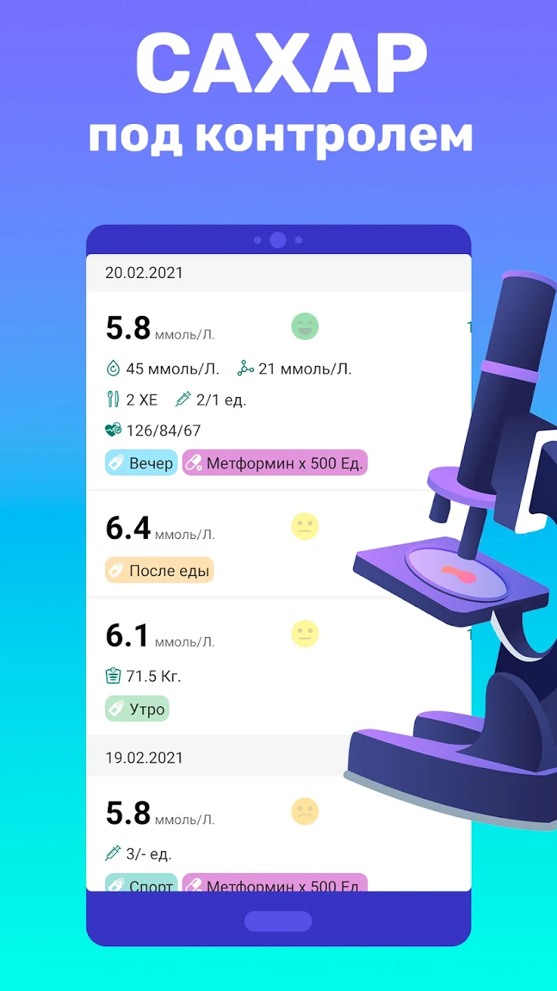 ✓ Добавление и управление принимаемыми лекарствами, а также детальная аналитика того, как лекарства влияют на уровень сахара в крови и самочувствие в целом;