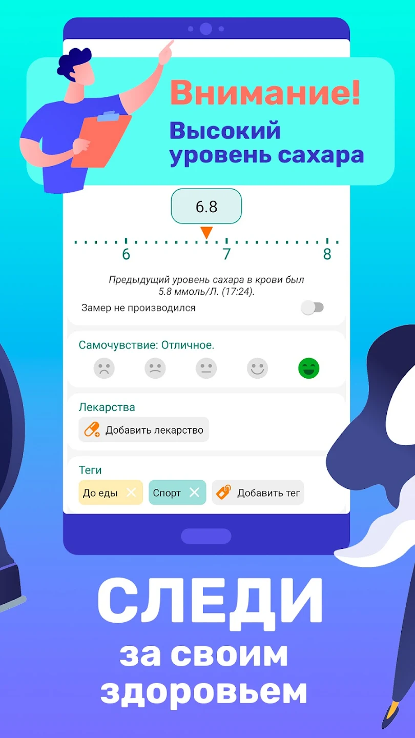 Описание:Одно из незаменимых приложений для людей, страдающих из-за сахарного диабета. Позволяет простым и удобным способом вносить данные об уровне глюкозы в крови, вести учёт приёма лекарственных препаратов. В наличии гибкая система уведомлений и развёрнутая система статистики, способная помочь вам в качественной оценке состояния здоровья. Дневник сахара позволит Вам фиксировать свои регулярные замеры и показатели – отслеживать уровень глюкозы и гемоглобина, уровень хлебных единиц, потреблённых в течении дня, а также назначать каждой записи теги, для удобства отслеживания динамики, принимаемые лекарства, вести учет инсулина и уровень инсулина, фиксировать свое эмоциональное состояние и вес.