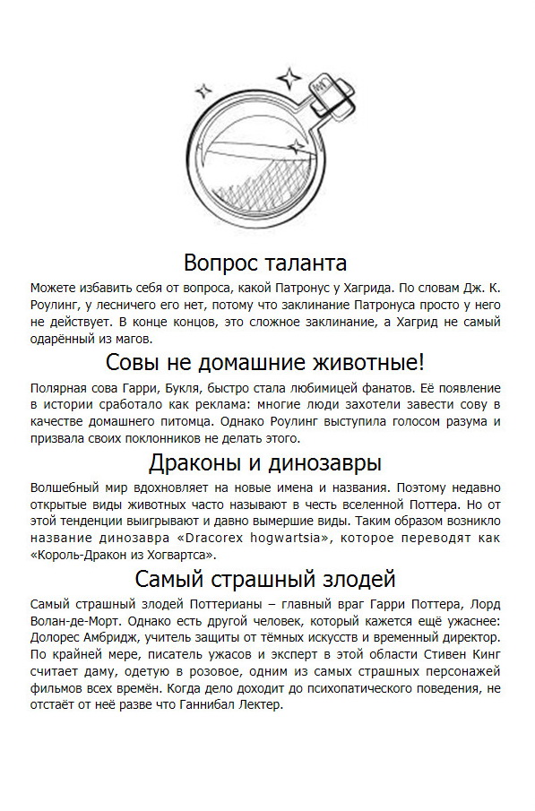 Это издание содержит почти 400 фактов на любой вкус как о волшебниках и мире волшебства, так и о книгах, фильмах, актёрах и, разумеется, самом авторе! Весёлые и грустные, странные и ошеломляющие факты – даже самый заядлый поклонник «Гарри Поттера» найдёт здесь что-то новое.