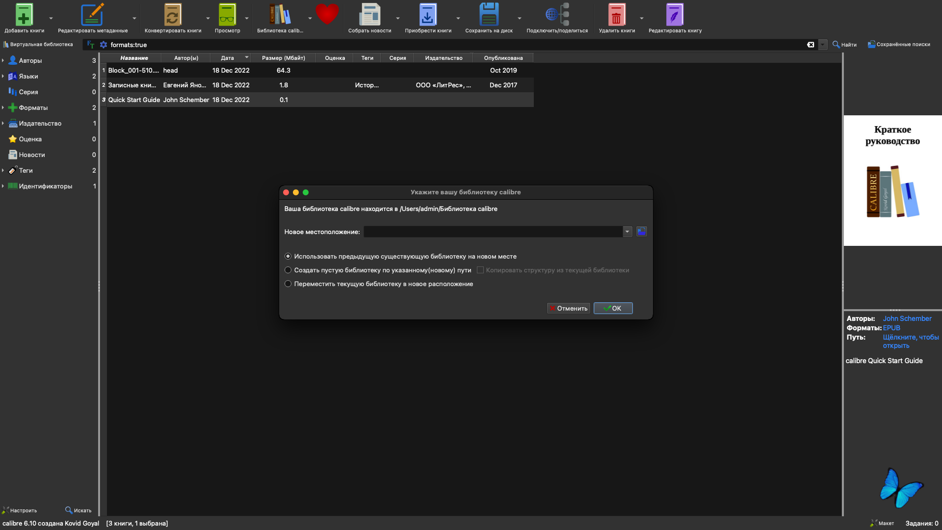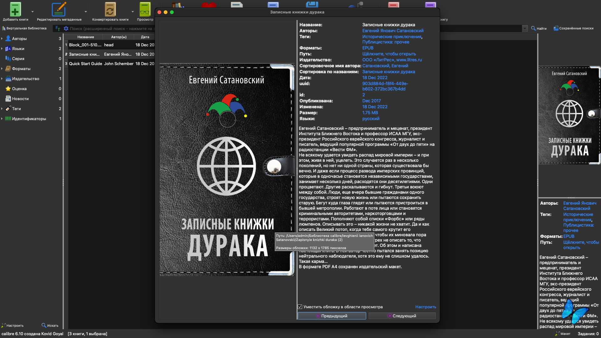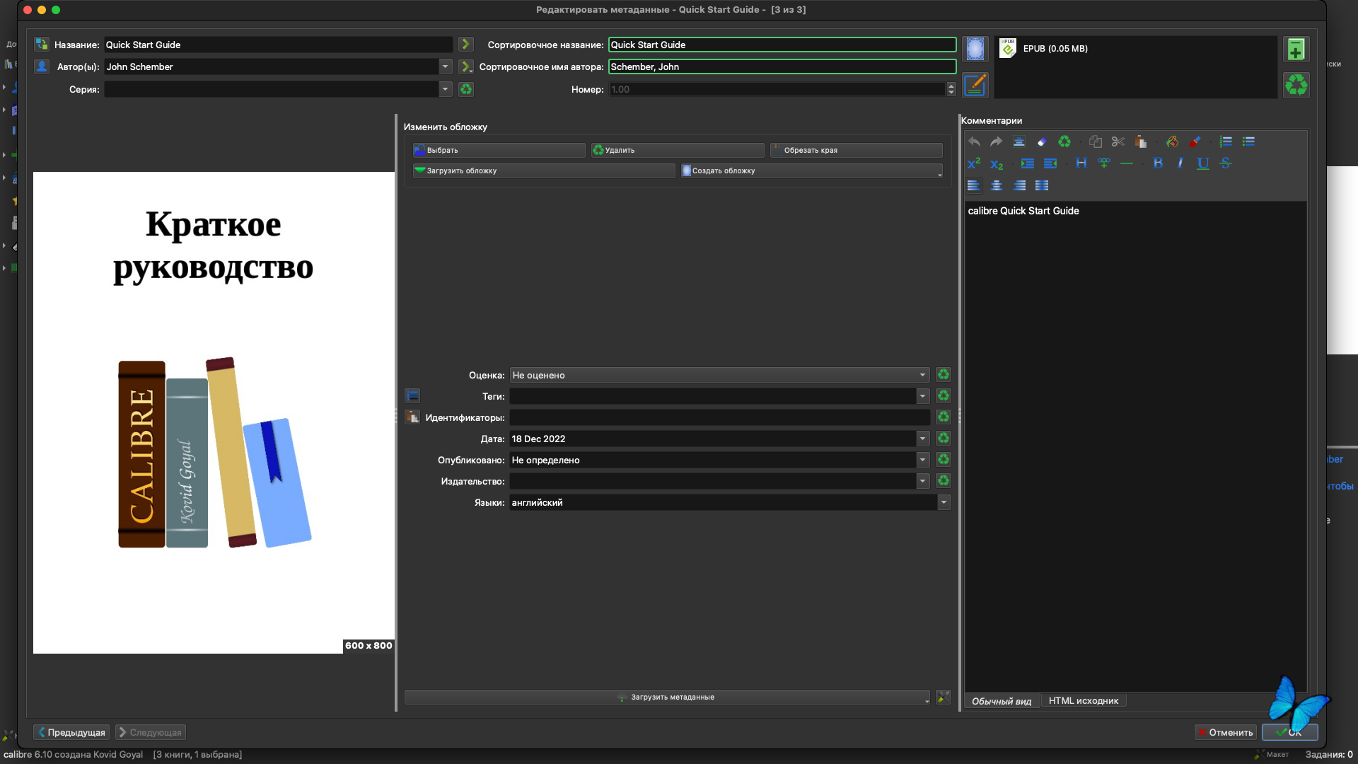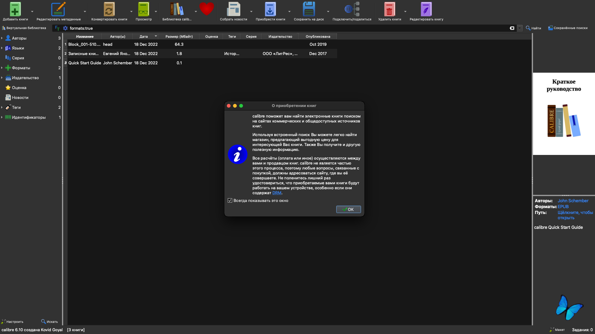 ● macOS 10.15 или выше ● Intel 64-bit CPU Описание:Calibre — это утилита с набором функций, необходимых владельцам и читателям электронных книг. В ее состав входит инструментарий для управления библиотекой, модули преобразования файлов электронных книг из одного формата в другой, интегратор новостей, модуль синхронизации данных с электронной читалкой и, конечно же, хороший просмотрщик. Простой, незамысловатый интерфейс программы позволяет быстро освоить работу с ней. Ключевые особенности: Управление библиотекой • Файлы электронных книг могут храниться в разных форматах, но при просмотре они представляются единым образом. Можно сортировать и искать книги по метаданным (название, автор, дата издания, дата добавления, размер, серия книг, рейтинг и т.п.). Также есть поддержка тегов, комментариев и обзоров. Книгу можно искать, используя простой или расширенный поиск. При добавлении книг поддерживается четкая иерархическая структура папок, что позволяет легко разобраться в библиотеке и при отсутствии программы. С помощью Calibre можно искать метаданные о книгах и обложки к ним в Интернете, используя название, фамилию автора или ISBN, причем система поиска метаданных основана на плагинах и может быть легко расширена самим пользователем