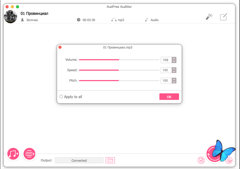 Преобразование видов аудио в MP3, FLAC, WAV, M4A и т. д. • AudFree Auditior - необычный аудиоконвертер, который дает вам возможность конвертировать песни Apple Music M4P, плейлисты, аудиокниги iTunes M4B, M4A и файлы Audible AA, AAX в другие простые форматы. Однако, если ваша аудиоколлекция представляет собой обычные аудиофайлы, вы также можете использовать этот интеллектуальный набор инструментов для преобразования аудиофайлов в другие форматы, такие как MP3, AAC, WAV, FLAC, M4A, M4B, без потерь с 30-кратной скоростью и одним щелчком мыши