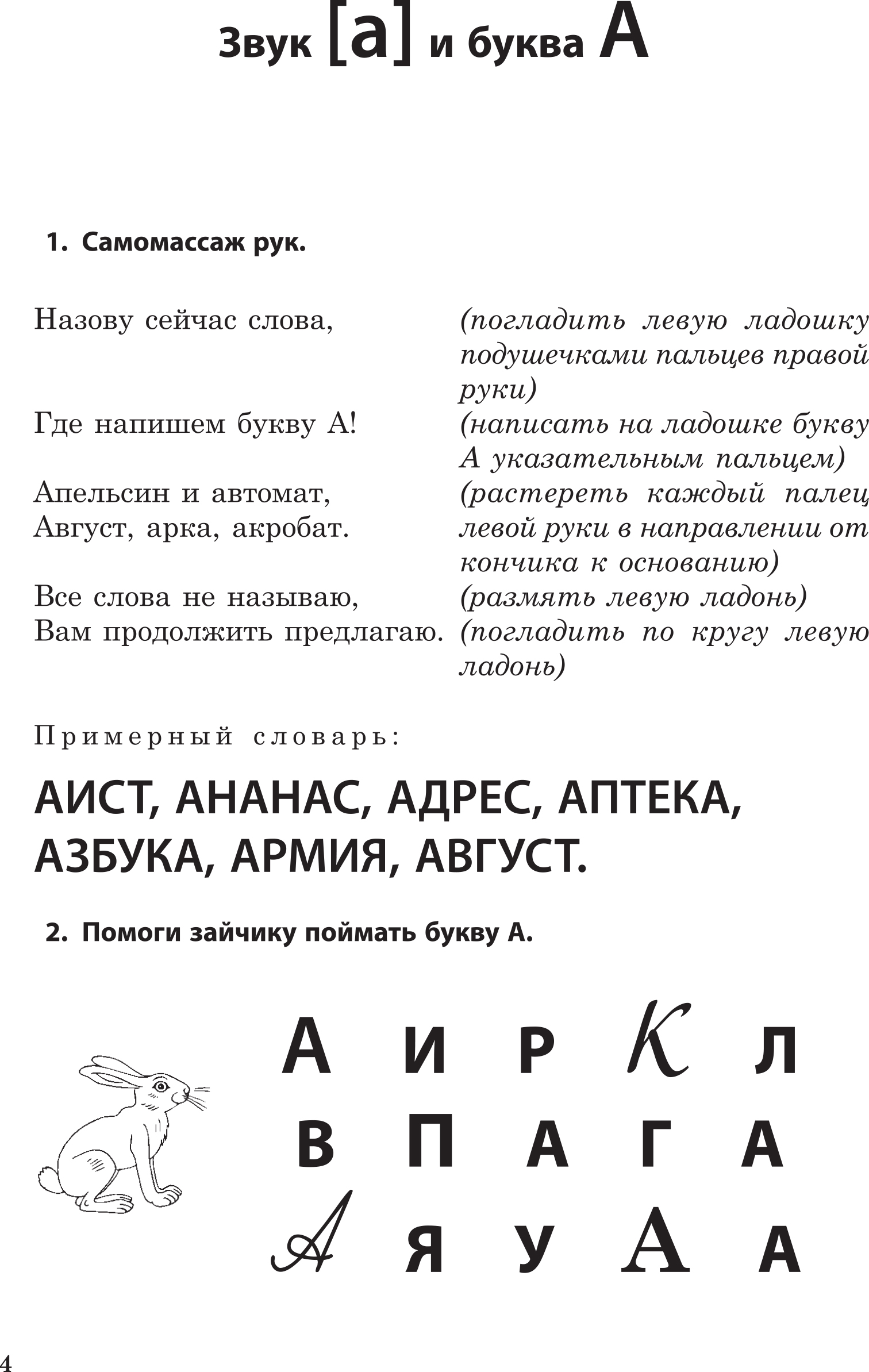 Описание:Книга поможет ребёнку усвоить азбуку, научит соотносить звук речи и букву, находить место звука в слове, а эти знания – фундамент для успешного овладения грамотой. Знакомство с каждым звуком речи и обозначающей его буквой превратится для ребёнка в увлекательную и полезную игру благодаря чтению забавных авторских стихов и выполнению движений самомассажа рук. Для взрослого книга станет незаменимой и верной помощницей в создании у дошкольника позитивного настроя по отношению к занятиям чтением и письмом, в подготовке руки ребёнка к письму.