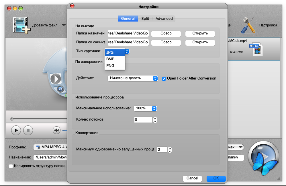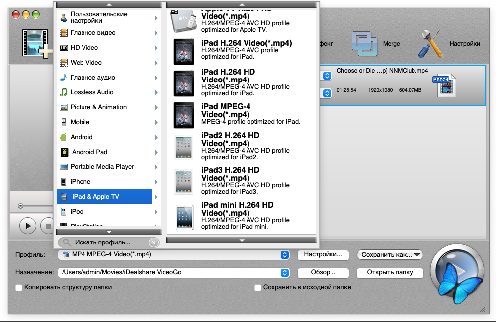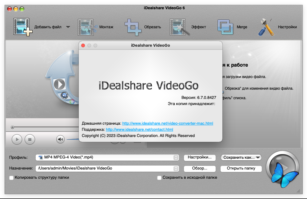 ● macOS 10.4 или выше ● Intel 64-bit CPU ● Apple M1 chip Описание:iDealshare VideoGo для Mac — лучший конвертер видео для Mac, который может преобразовывать все виды видео- и аудиофайлов для успешного импорта в iMovie, Final Cut Pro, Final Cut Express, Avid, Sony Vegas или для удобного воспроизведения в iTunes, QuickTime, iPad, iPhone, iPod, Apple TV и т. д. Он также поддерживает преобразование MPEG-4, MOV, M4V, Apple Lossless M4A, AIFF, M4R, M4B и т. д., изначально поддерживаемых Mac или Apple, в другие популярные видео- или аудиоформаты для успешного воспроизведения или редактирования на устройствах, отличных от Apple-Mac, таких, как Windows. Ключевые особенности: • Конвертирует видеофайлы в популярные видеоформаты в SD или HD. • Конвертирует видео и музыку, или переконвертирует аудио в другой формат аудио. • Скачивает и конвертирует онлайн-фильмы, музыку и видео. • Конвертирует видео для потокового MP4, MOV для последующей загрузки на веб-сайты видеохостинга. • Конвертирует видео для просмотра на iPad, iPhone, Android-устройствах, Samsung Galaxy, PSP, BlackBerry, Google Nexus, Microsoft Surface, Xbox и т.д. • Редактирует видеофайлы: обрезает, отрезает, объединяет, разделяет на главы и отрезки, вращает, сжимает видео, изменяет битрейт и громкость видео и звука, добавляет субтитры\эффекты\аудиодорожки\водяные знаки и т.п.