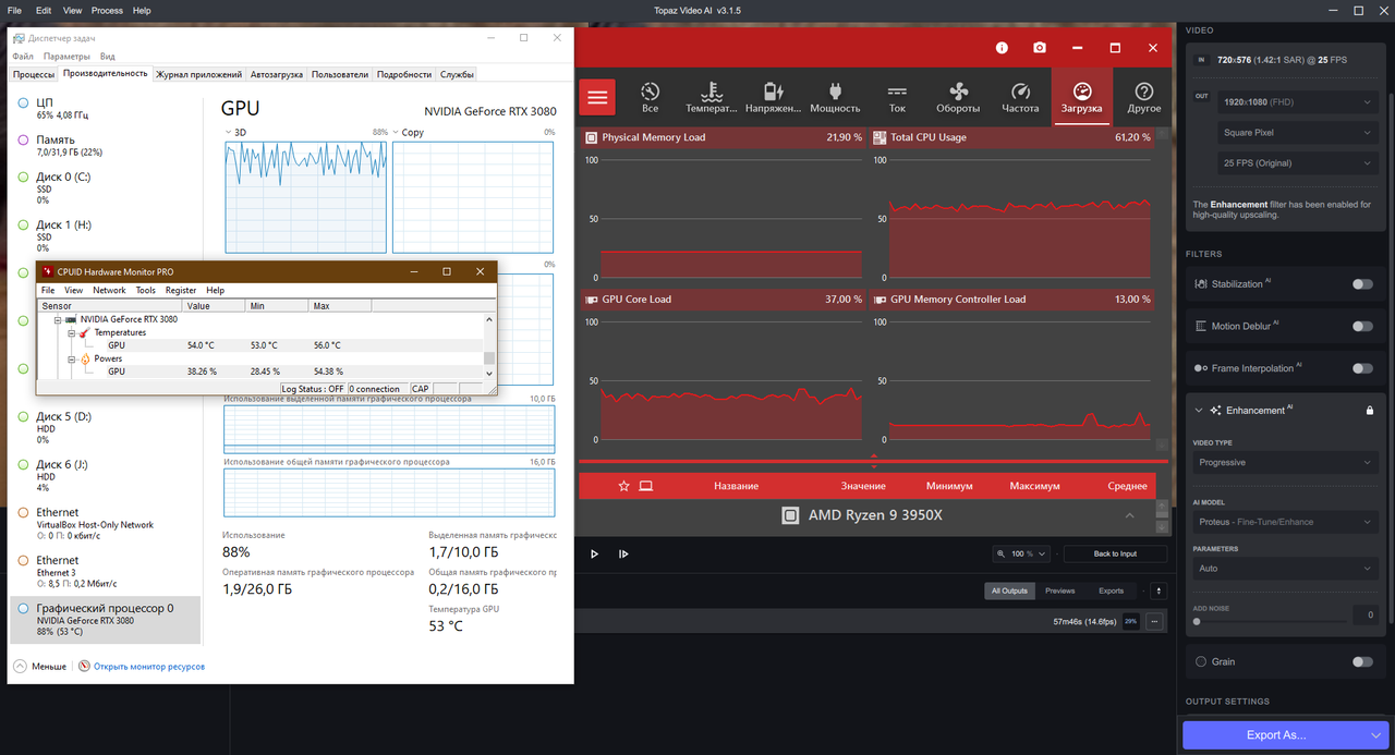 Кто смотрел в диспетчер задач при работе програмы? Поставила на пробу и выставила - RTX3060 использовать, карта не юзается, с нее берется 2ГБ памяти для просчета и.. всё! Загрузка карты 0%, все через проц идет, а он загружен на 40% при апскейле до 1080р. У всех такая фишка? |
