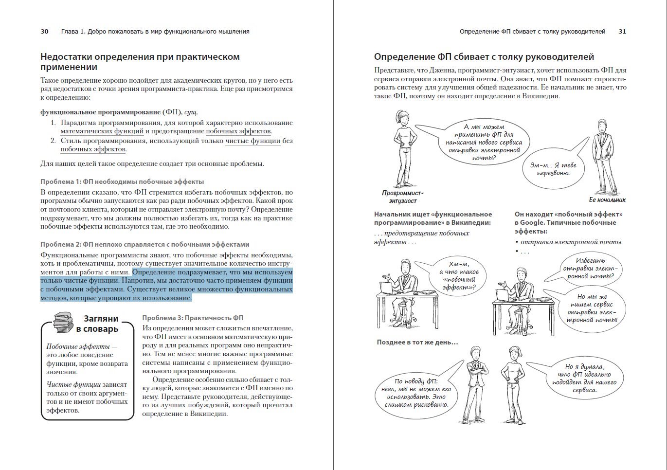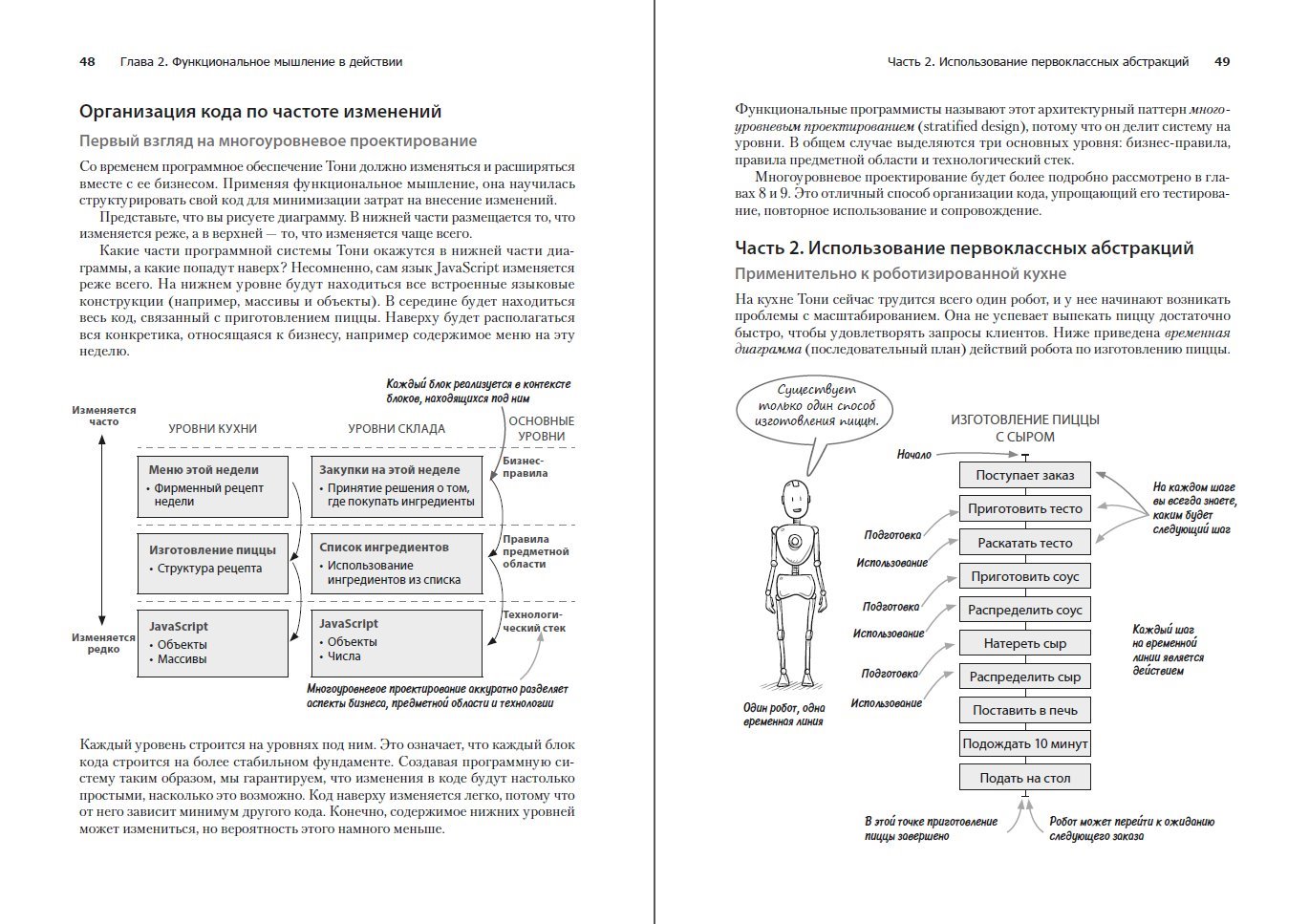 Книга написана для программистов с практическим опытом от 2 до 5 лет. Предполагается, что вы уже знаете хотя бы один язык программирования. Также желательно, чтобы вы построили хотя бы одну достаточно крупную систему, чтобы представлять, с какими проблемами разработчики сталкиваются при масштабировании. Примеры написаны на JavaScript, направленном на читаемость кода. Если вы понимаете код C, C#, C++ или Java, у вас не будет особых сложностей. Я использую JavaScript вовсе не потому, чтобы показать вам, что на JavaScript можно заниматься функциональным программированием. Собственно, JavaScript не блещет в области ФП. Но именно потому, что в нем не реализована серьезная поддержка ФП, этот язык отлично подходит для обучения. Многие функциональные конструкции приходится строить самостоятельно, что позволит нам глубже понять их. Кроме того, вы будете больше ценить такие конструкции, предоставляемые языком (таким, как Haskell или Clojure).
