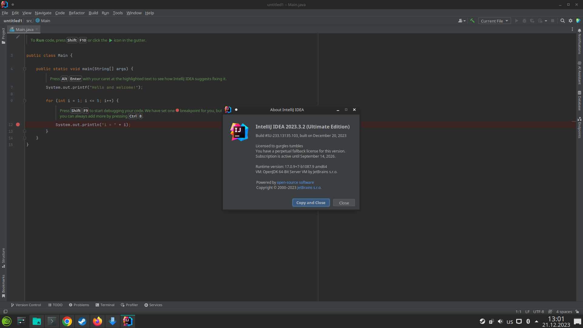 Уточнение для пользователей Виндовс-11 Про : здесь версия для Линукса, однако патч и Код Активации работает, если вы скачаете с официального сайта триальную версию Идеа. - Распаковка Rar-архивов стала возможна только после запуска архиватора RAR - от имени Администратора. - Для пользователей Виндовс-11 Про здесь интересен только Архив "jetbra.tar.gz" и текстовый файл - Activation Code. Переходим на официальный сайт и скачиваем Триальную версию (для Виндовс) программы Идеа (актуально на 10сент 2023), версия , которую можно скачать с официального сайта >> ideaIU-2023.2.1.exe - Запускаем установку триальной Идеа - после окончания установки не открываем программу ! Процедура лечения: Пункт 2 для пользователей Винды -- в папке scripts запускаем файл install-current-user.vbs (For current user) или install-all-users.vbs (For all users) >> я использовал этот файл для активации Появляется окошко - жмём Ок. Дожидаемся ребута и появления окошка, где написано Done . Жмём -Ок . - Теперь запускаем установленную ранее триальную программу Идеа. Вставляем КОД из текстового файла. - Активация готова до 1 августа 2025 года. |