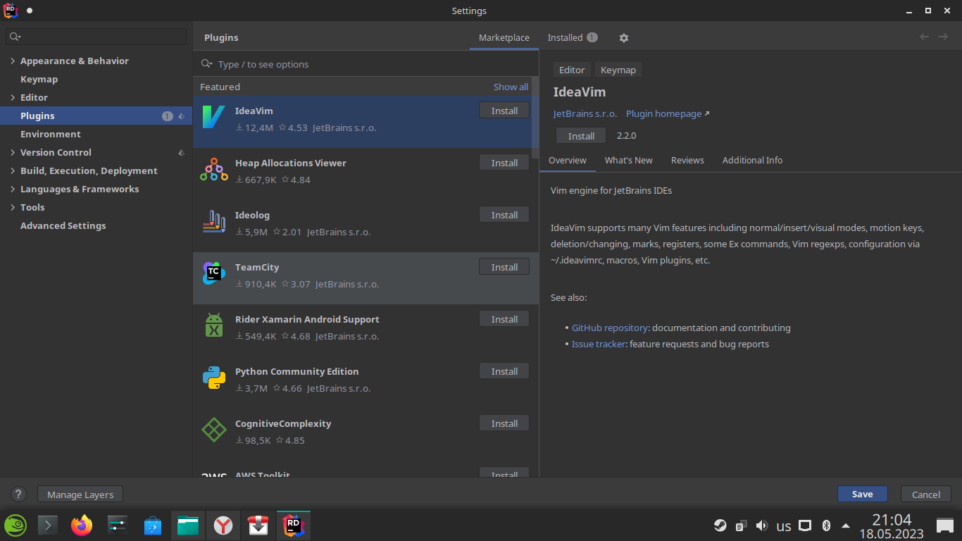 Rider поддерживает большой набор плагинов, разработанных для ReSharper и платформы IntelliJ. Встроенные плагины обеспечивают поддержку F#, Unity и систем контроля версий. Вы можете дополнительно подключить расширения для работы с Markdown, файлами .gitignore и Python-скриптами.
