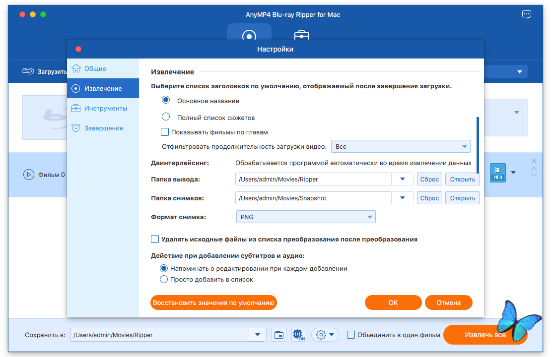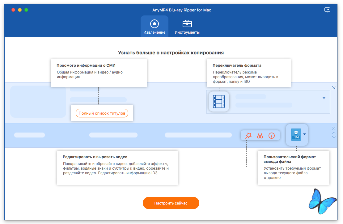 ● macOS 10.10 или выше ● Intel 64-bit CPU Описание:AnyMP4 Blu-ray Ripper разработан с наиболее эффективными решениями для копирования дисков Blu-ray в любой популярный видеоформат, такой, как MP4, TS, MKV, MOV, M4V, AVI, WMV, VOB, DivX, XviD, MPEG, F4V, WebM. и даже больше, и даже конвертировать Blu-ray в HD-видео 4K и 1080p с кодеком H.265, H.264, MPEG4, XviD, VP8, VP9 и другими. Он также извлекает фоновую музыку из фильмов Blu-ray для сохранения в формате MP3, M4A, AAC, FLAC, ALAC, WMA и других для вашего удовольствия от музыки. Поддерживаемые форматы ввода: Блю рей: Blu-ray диск, папка Blu-ray