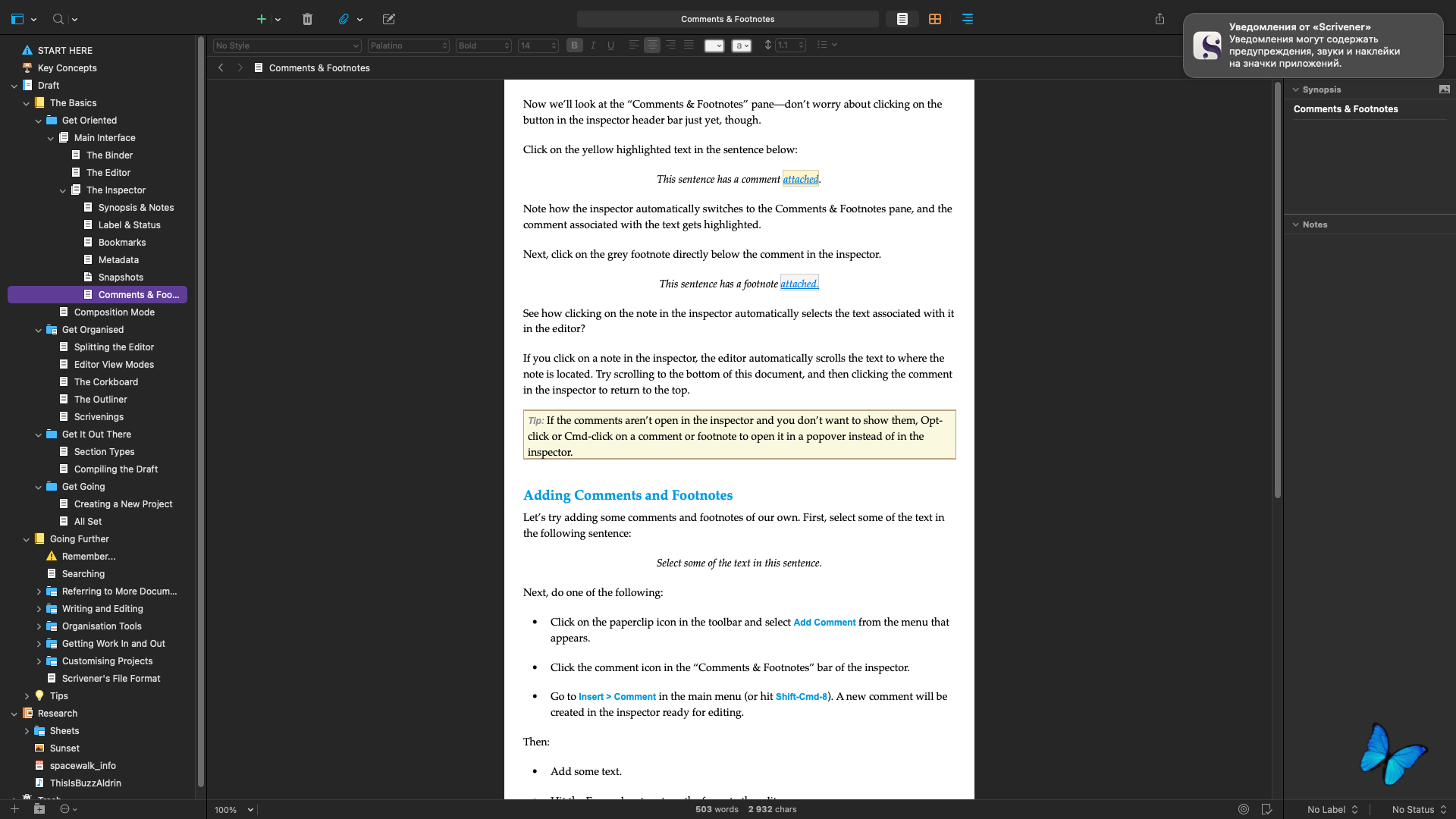 Любая работа над книгой требует исследований, изучения дополнительного материала. Создав новый проект в Scrivener, вы автоматически получаете папку Research, где можно хранить дополнительные данные. Это могут быть не только текстовые заметки, но и PDF, аудиоматериалы, изображения.