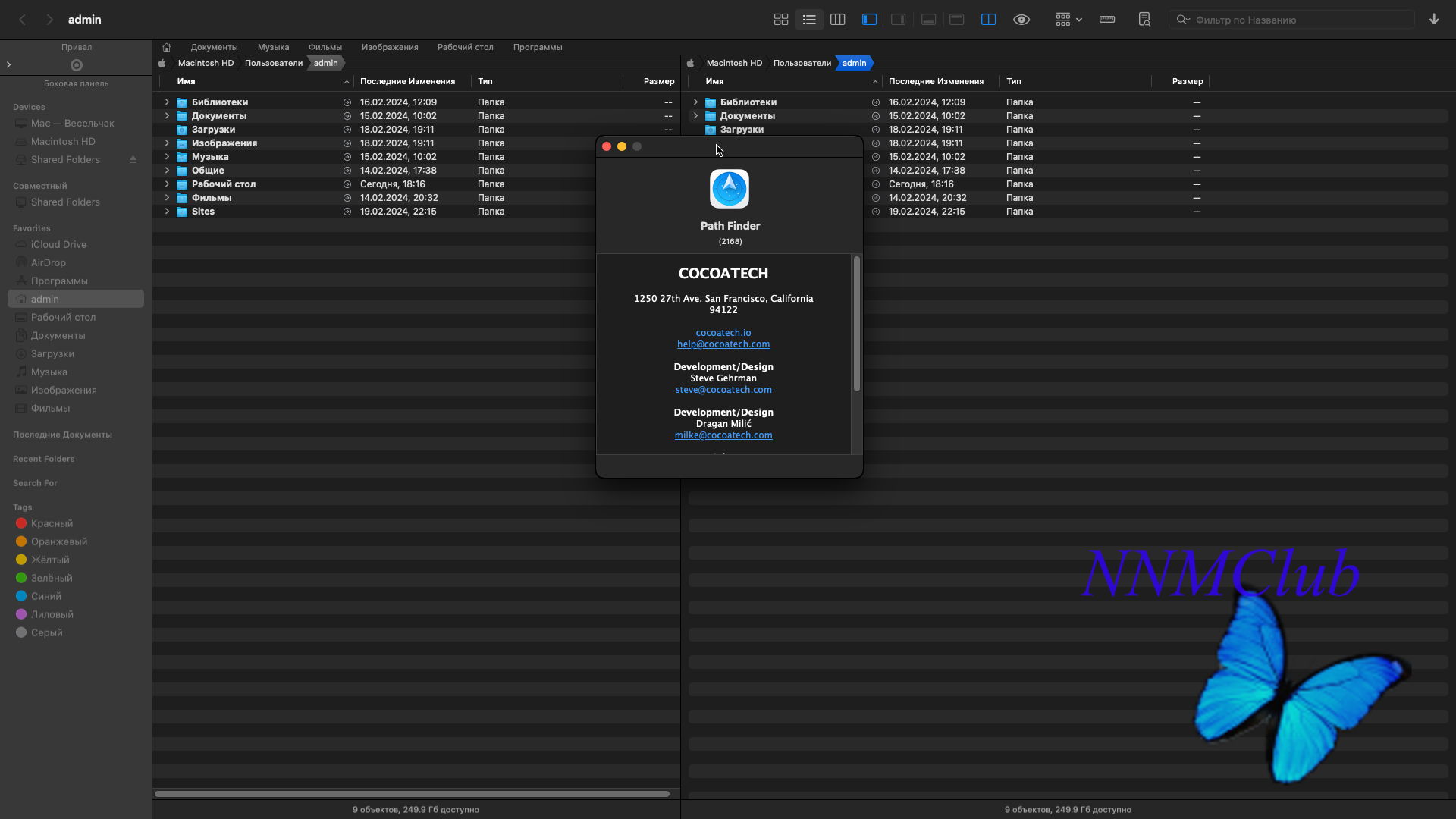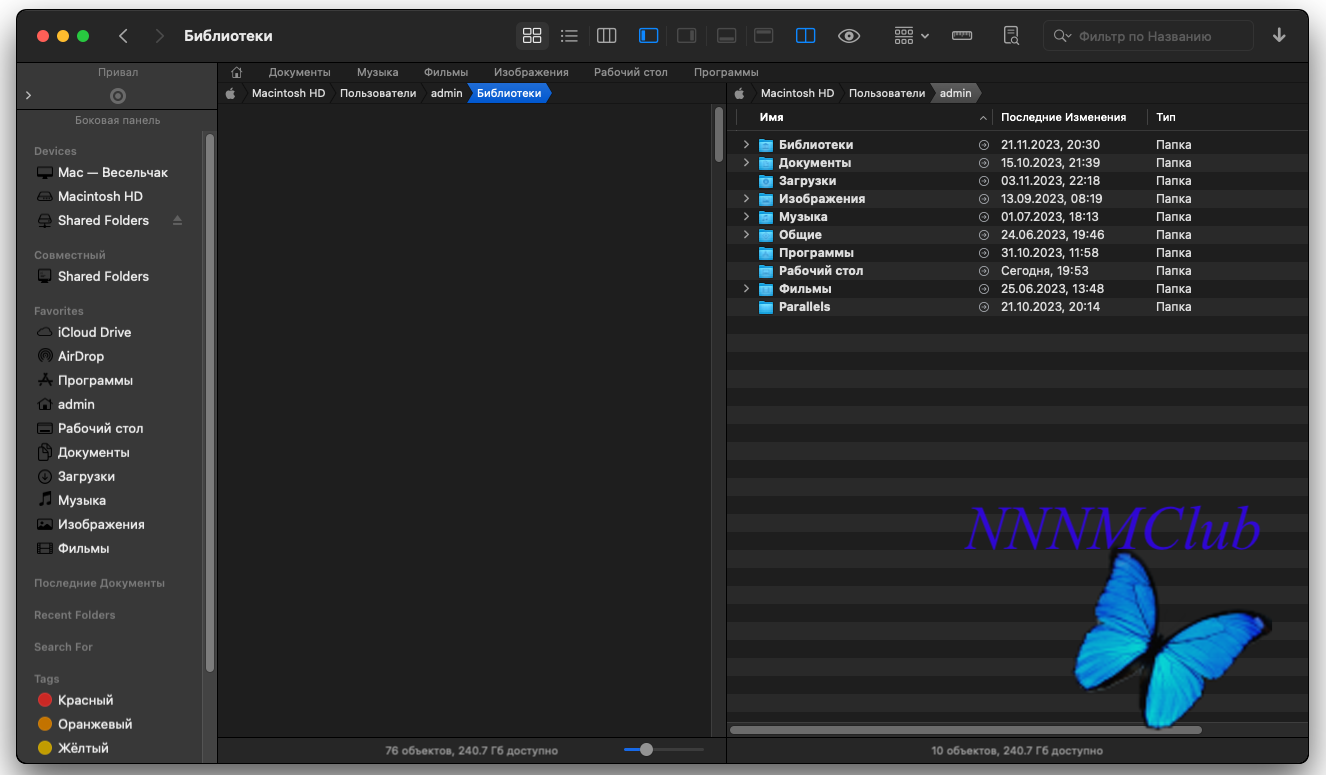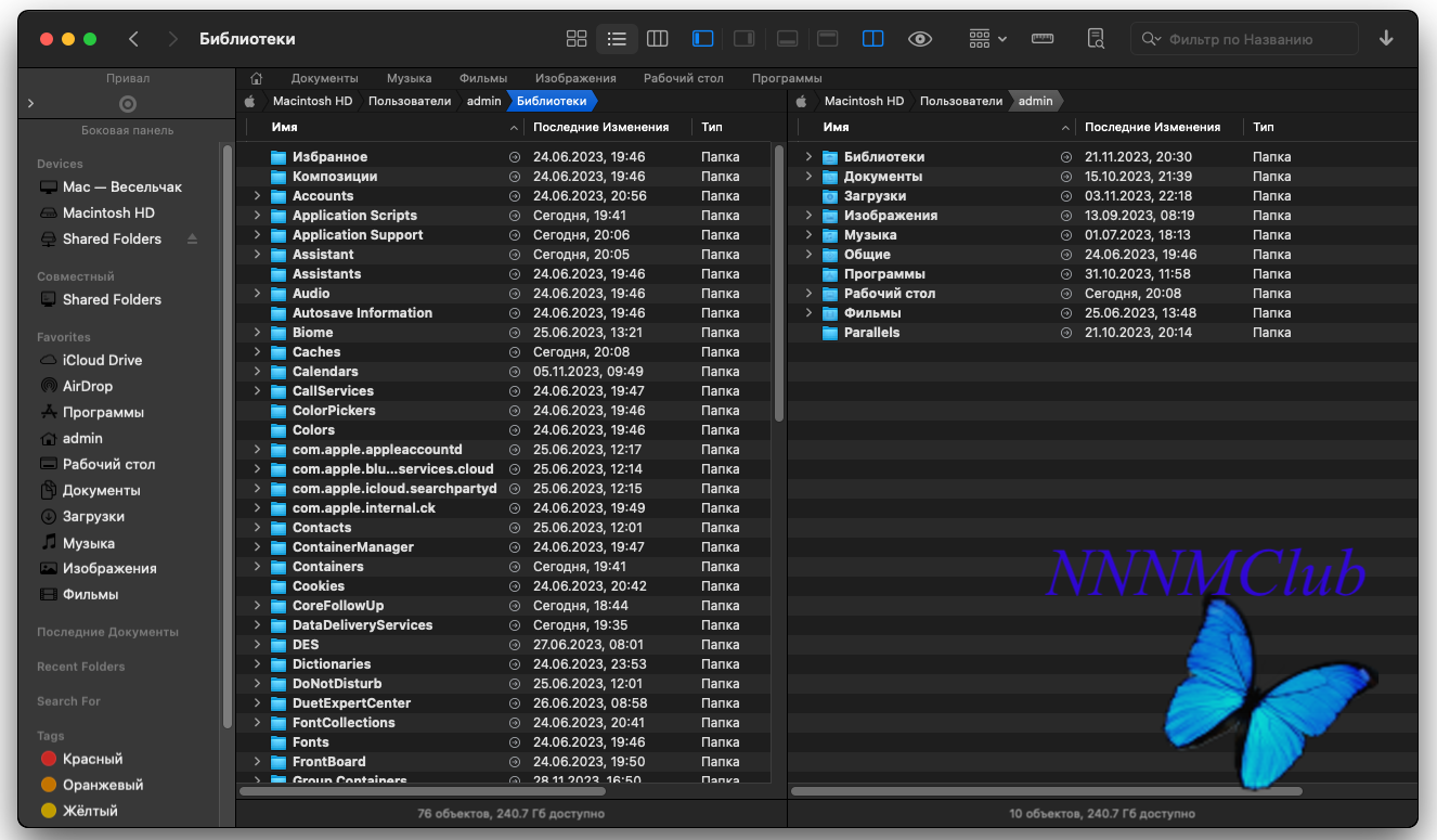 • Режим просмотра «двухпанельный проводник» в Path Finder делит окно пополам, так что вы можете видеть две папки одновременно. Очень полезно при сравнении содержимого папок или перемещении файлов между папками. Каждая панель – это отдельный файловый браузер. Вы можете перейти в такой режим просмотра, нажав на иконку внизу слева.