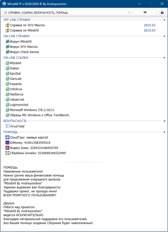 Поддержи проект, не проходи мимо!ВСЕМ ПРИЯТНОГО ПОЛЬЗОВАНИЯ!!! Работа над проектом MInstAll By Andreyonohov ведётся ИСКЛЮЧИТЕЛЬНО благодаря материальной поддержке его пользователей. Без Вашей помощи создание Сборника будет невозможным! Заранее выражаю вам благодарность! Поддержи проект, не проходи мимо! ВСЕМ ПРИЯТНОГО ПОЛЬЗОВАНИЯ!!!CloudTips: чаевые картой | ЮMoney: 410013583545519 | Яндекс Банк: 2204310186452705 | Сбербанк Онлайн: 5336690346522495 |