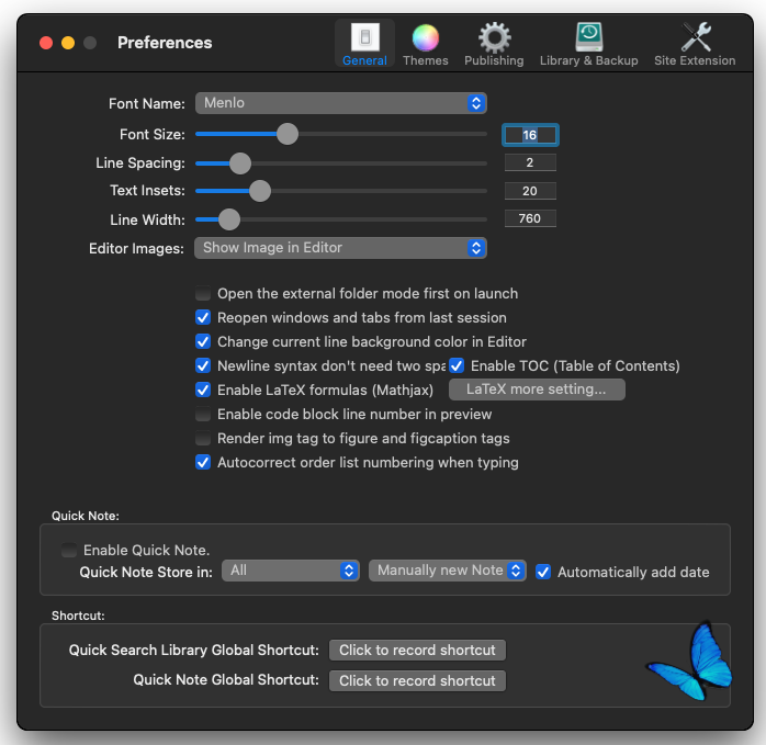 MWeb поддерживает расширенный синтаксис Github: TOC, Table, Fenced code block, LaTex,Task lists, Footnote и др. MWeb имеет красиво оформленную темную тему и предлагает интересные функции, как прокрутка, папки Drag & Drop, вставку изображения и др. MWeb поддерживает LaTex Просмотр в on-редакторе! MWeb также поддерживает режим просмотра изображений в реальном времени, Outline View и т. д. В режиме внешнего редактора, вы можете редактировать общие текстовые и файлы Markdown из любого места на вашем Mac. Например, вы можете связать MWeb с папкой на Dropbox.