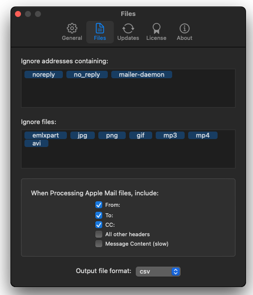 Просто перетащите файл на главное окно приложения, выберите формат выходного файла и быстро получите список всех email адресов без дубликатов. Поддерживаются форматы: Apple Mail database, iWork, docx, xlsx, zip и текстовые PDF файлы (не OCR).
