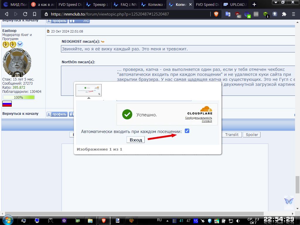 ... проверка, капча - она выполняется один раз, если у тебя отмечен чекбокс "автоматически входить при каждом посещении" и не удаляются куки сайта при закрытии браузера. У нас самая щадящяя капча из существующих. Это не Гугл с его брандспойтами и мотоциклами и не Яндекс с его двухминутной загрузкой картинки. Просто поставь галочку в нужное место  |