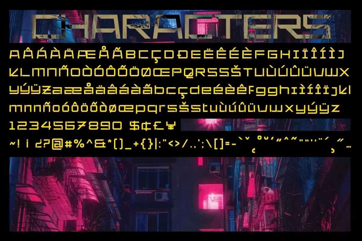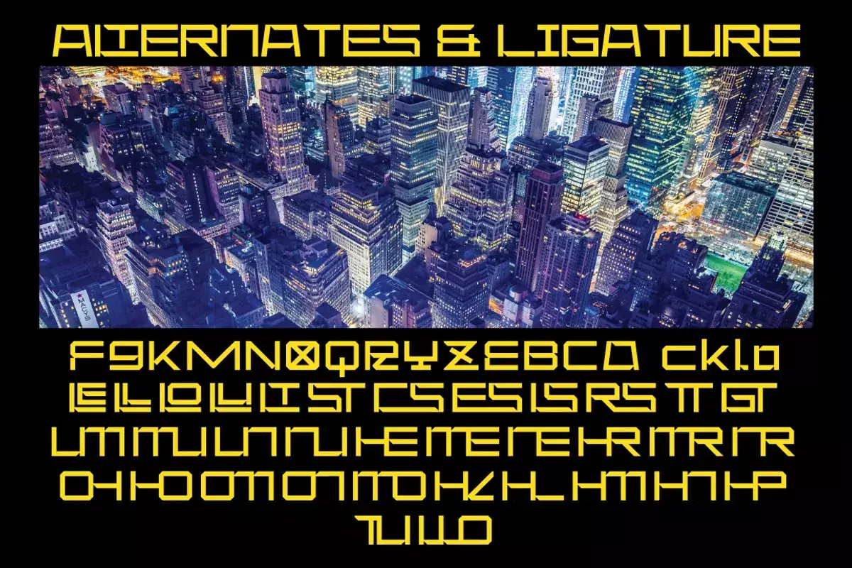 Описание:Шрифт Klase Cyberpunk содержит более 250 глифов. Альтернативные символы были разделены на несколько функций Open Type, таких как Swash, Stylistic Sets, Stylistic Alternates и Ligature.