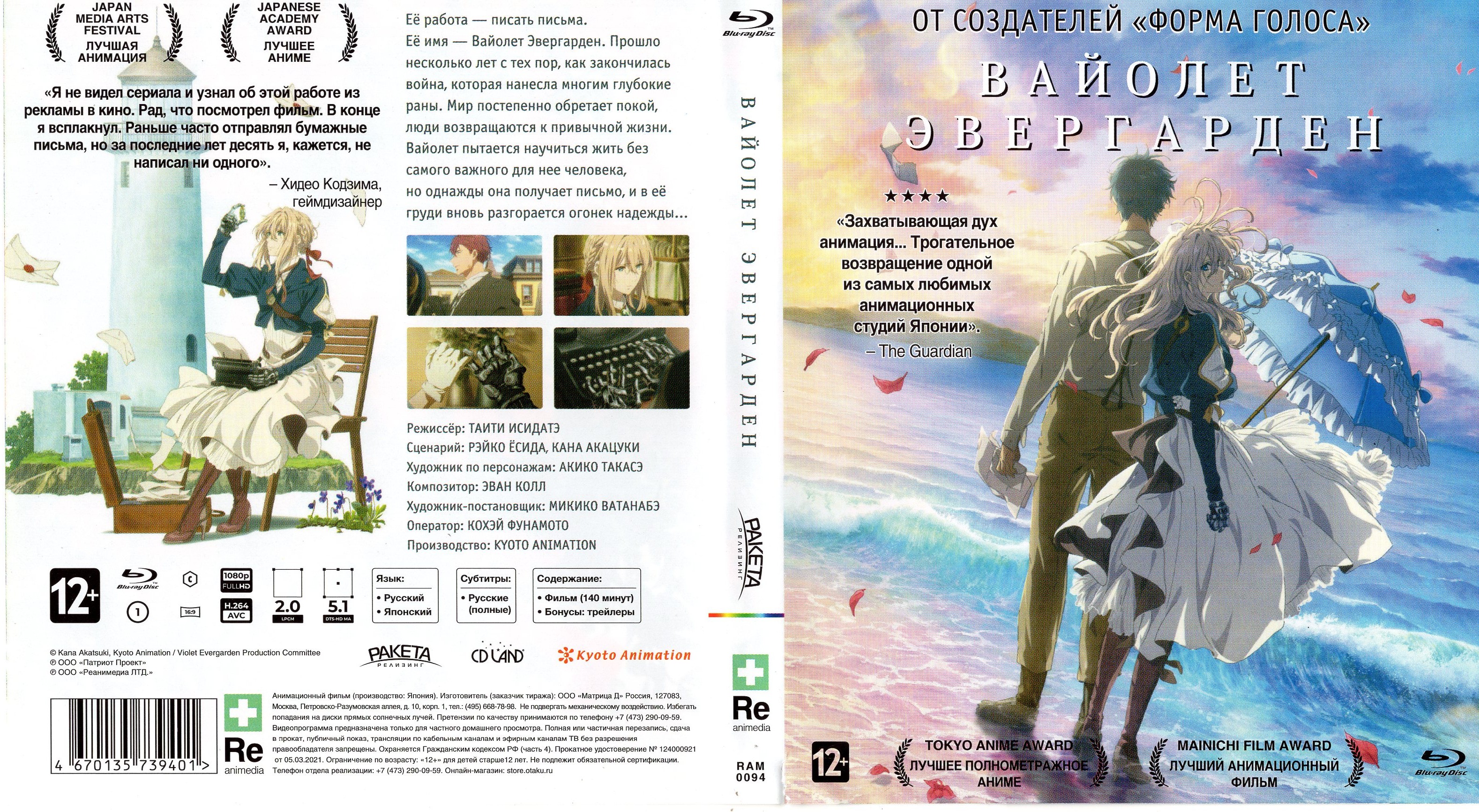Тип: Полнометражный фильм Жанр: приключения Продолжительность: 140 мин. Дата выпуска: 18.09.2020 г. Производство: Kyoto Animation Автор оригинала: Акацуки Кана Режиссер: Исидатэ Тайти Ссылки: World-Art, ANN, AniDB, MyAnimeList, Сетка ВещанияОписание:Её работа — писать письма. Её имя — Виолетта Эвергарден. Прошло несколько лет, с тех пор как закончилась война, которая нанесла многим глубокие раны. Мир постепенно обретает покой, люди возвращаются к привычной жизни. Виолетта пытается научиться жить без самого важного для нее человека и не обращать внимания на свои чувства. Но однажды она получает письмо, и в её груди вновь разгорается огонек надежды… Язык озвучки: Японский и Русский Субтитры: Русские Перевод: Reanimedia Качество видео: Blu-ray Видео: AVC/H.264 (Progressive High@L4.1) 8-bit, 1920x1080 (16:9), 24.000 fps, 26.2 mbps Аудио 1: LPCM, RUS(int), 2.0 ch, 48.0, 2304 kbps | Озвучка: Reanimedia 2.0 Аудио 2: DTS-HD, RUS(int), 5.1 ch, 48.0, 3578 kbps | Озвучка: Reanimedia 5.1 Аудио 3: LPCM, JAP(int), 2.0 ch, 48.0, 2304 kbps | Озвучка: Original 2.0 Аудио 4: DTS-HD, JAP(int), 5.1 ch, 48.0, 3443 kbps | Озвучка: Original 5.1 Скриншоты: