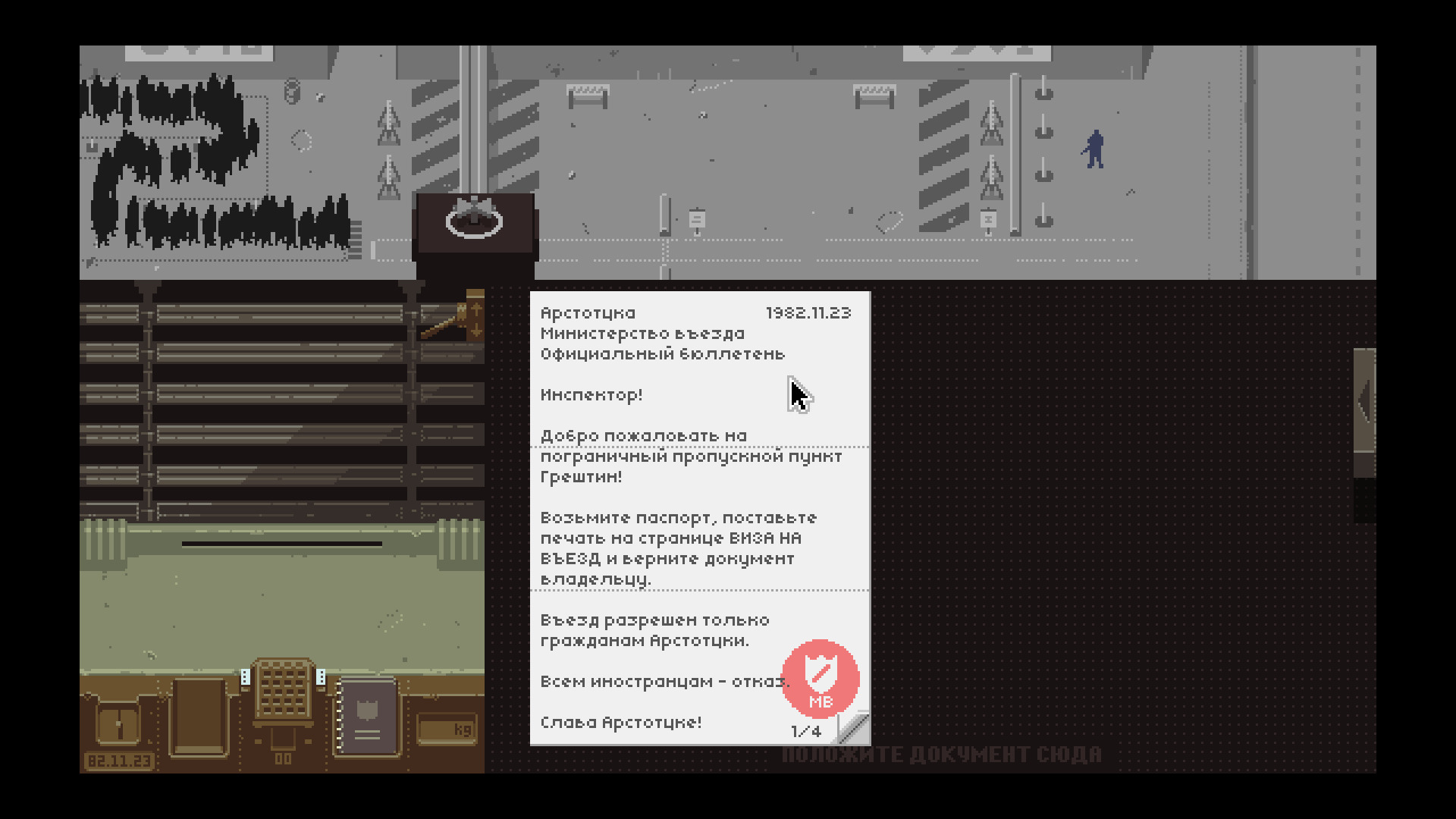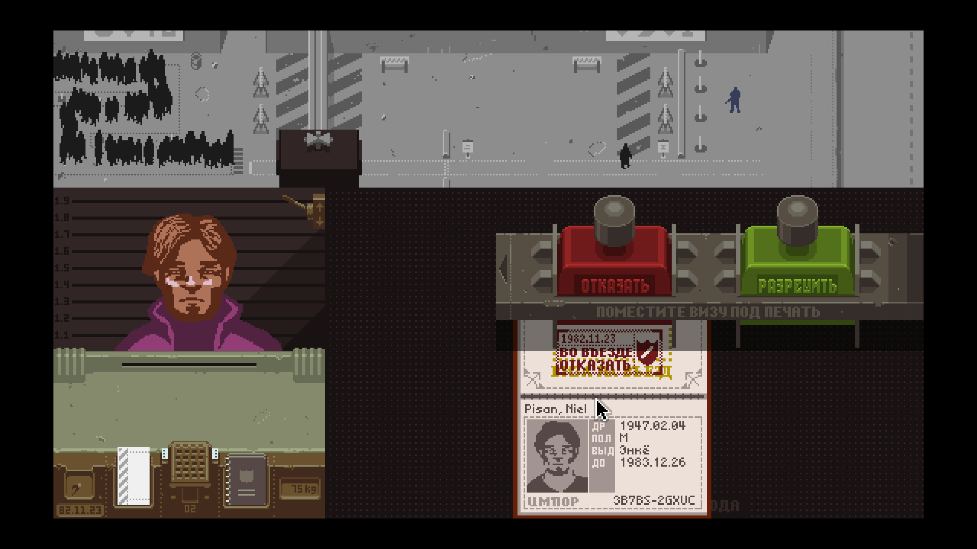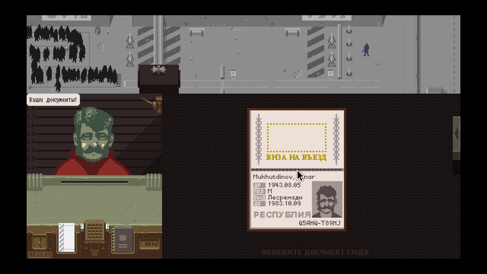 Описание:Коммунистическая держава Арстоцка только что завершила шестилетнюю войну с соседним государством Колечией и вернула принадлежащую ей половину города Грештина. Вы - пограничный инспектор, и ваша задача - контролировать доступ людей, намеревающихся перейти арстоцканскую границу со стороны Колечии. В толпе иммигрантов и надеющихся найти работу соискателей скрываются контрабандисты, террористы и шпионы. Вы должны изобличить их, изучая предъявляемые документы и полагаясь только на собственное внимание и примитивное оборудование, предоставленное министерством иммиграции: системами обыска, сличения данных и снятия отпечатков пальцев. Только вам решать, кто заслуживает допуска в страну, кому следует отказать, а кого - задержать или арестовать.
