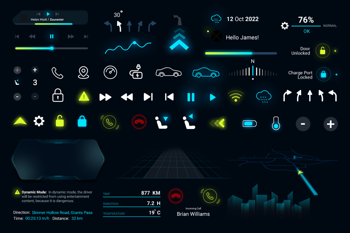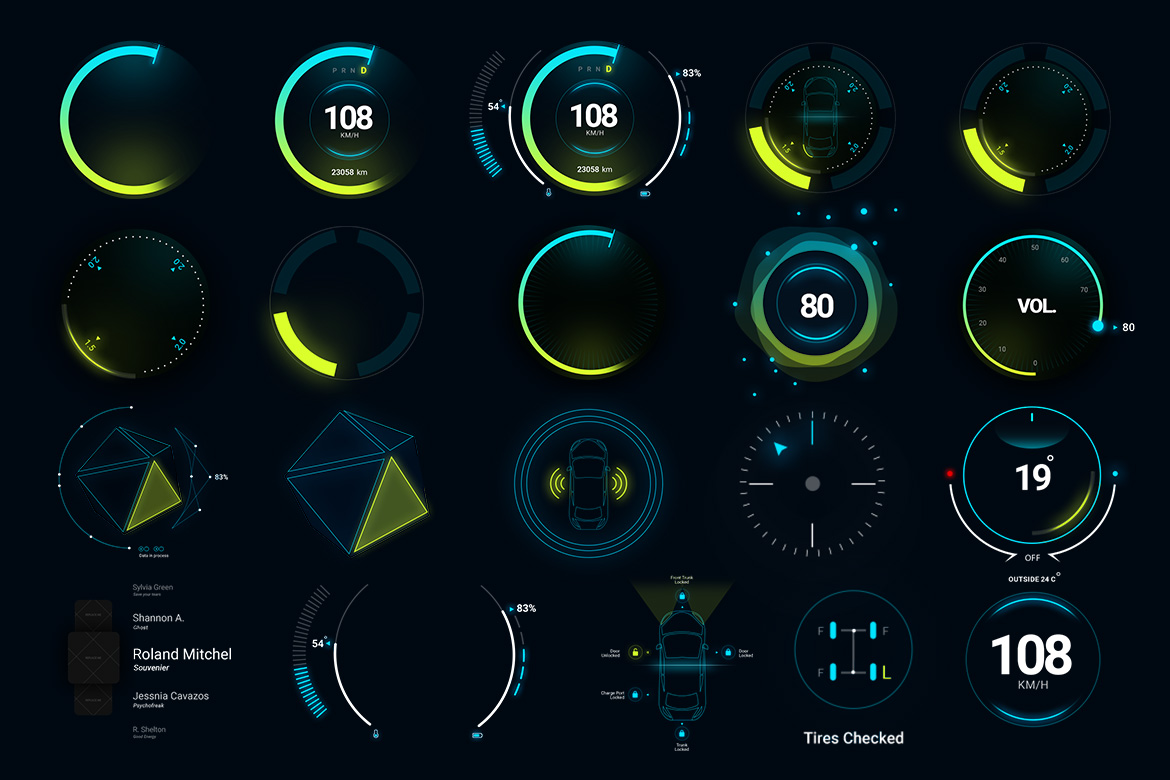 Все элементы и шаблоны Smart Car HUD представляют собой файлы PSD Photoshop, которые можно легко настраивать в продуктах Adobe и преобразовывать в желаемый стиль и форму для вашего проекта.
