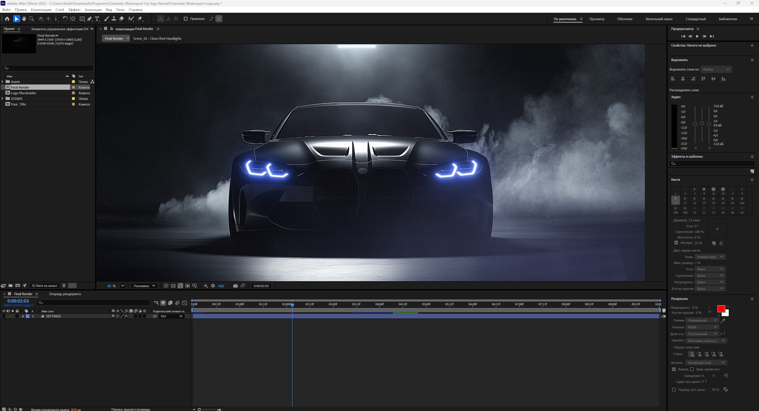 Описание:Cinematic Car Motorsport Logo Reveal — это быстрый и креативный анимированный шаблон After Effects, содержащий эффектный логотип. Передняя часть современного автомобиля полностью скрыта тенью, и только острые фары светятся, словно глаза, пронзающие темноту. Сцена освещена эффектным светом, подчёркивающим контуры силуэта автомобиля. В нём используется потрясающее сочетание эффектов, которые раскрывают и улучшают ваши медиафайлы. Вы можете использовать его в качестве краткого вступления к вашим видеороликам на автомобильную тематику. Короткое введение к вашим презентациям и слайд-шоу. Впечатлите свою аудиторию этим потрясающим шаблоном After Effects. Требуется бесплатный плагин VC Color Vibrance - идет в раздаче.