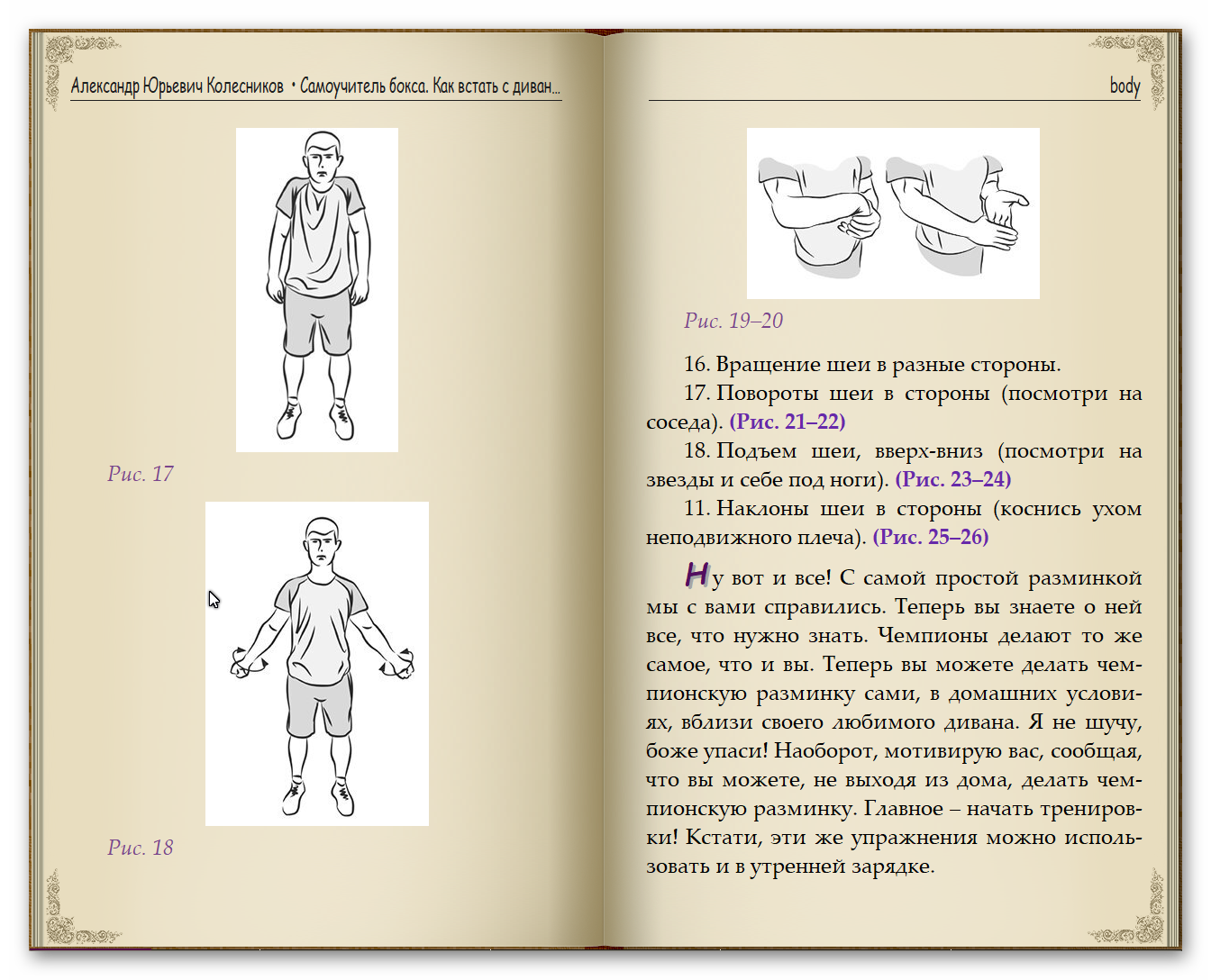 В доступной и увлекательной форме автор рассказывает историю отечественного бокса, знакомит читателя с первыми чемпионами Российской империи и пошагово даёт советы, как начать осваивать боксёрское мастерство в домашних условиях, не отходя от своего любимого дивана.