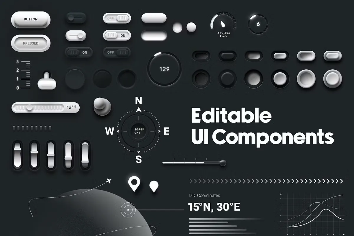 - Элементы футуристического дизайна: такие функции, как компасы, спидометры и графики, идеально подходят для проектов в области технологий или научной фантастики.